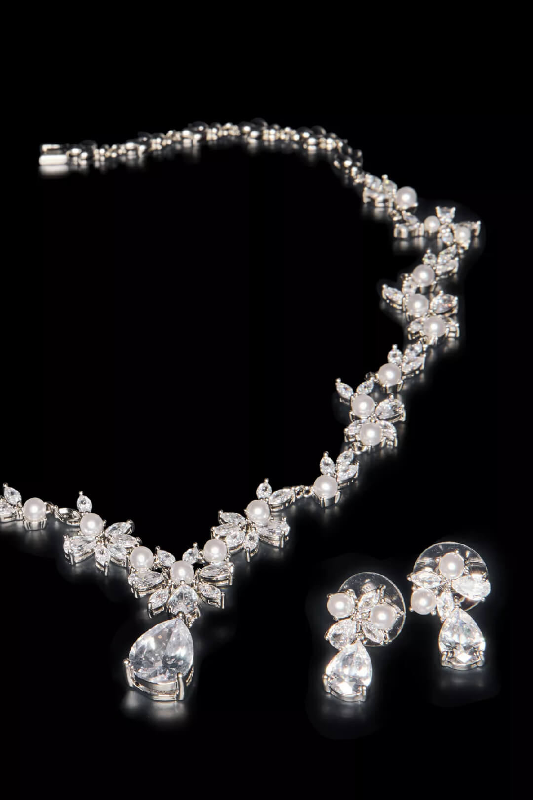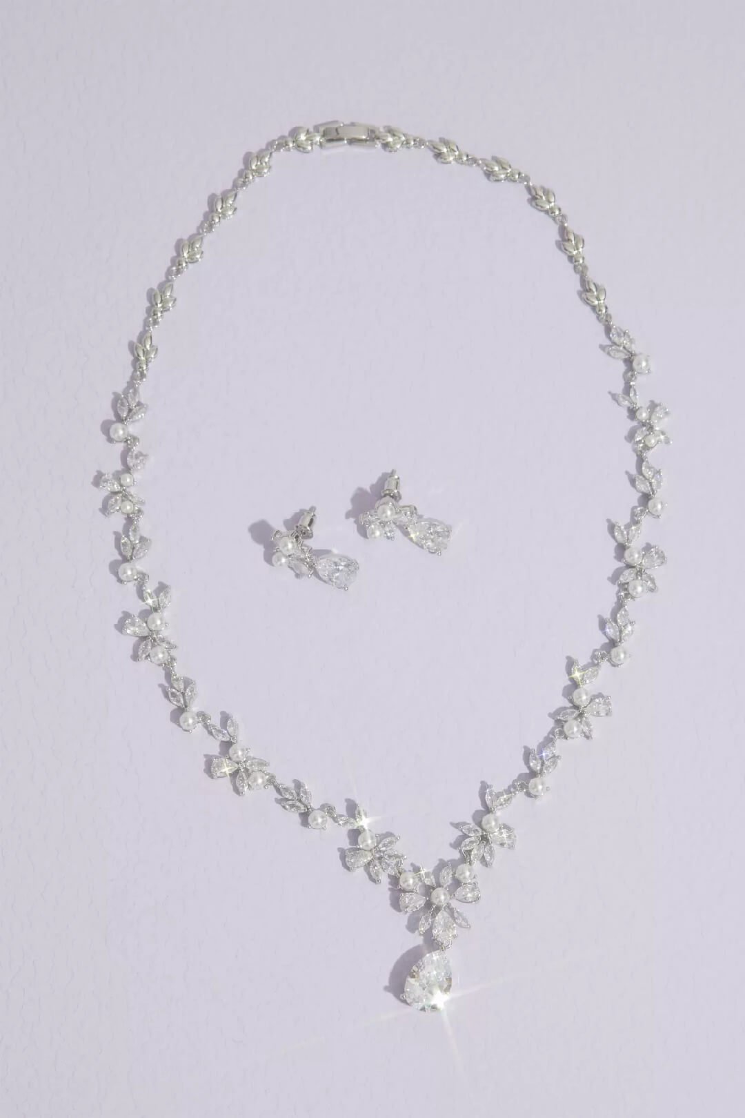 Adornado con cristales de zirconia y perlas, este conjunto de collar y aretes con diseño floral dan un toque de elegancia a tu look.