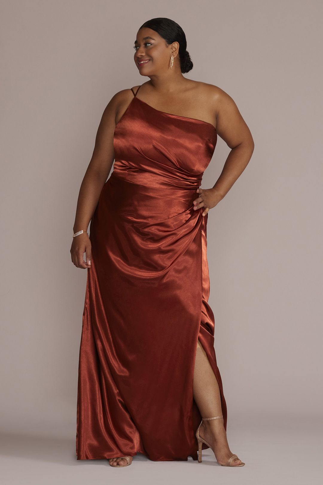 ¡Luce radiante con este hermoso vestido de dama! Su delicado escote asimétrico con plisado lateral con botones, se complementan perfecto con una falda de abertura en pierna. Robarás todas las miradas.