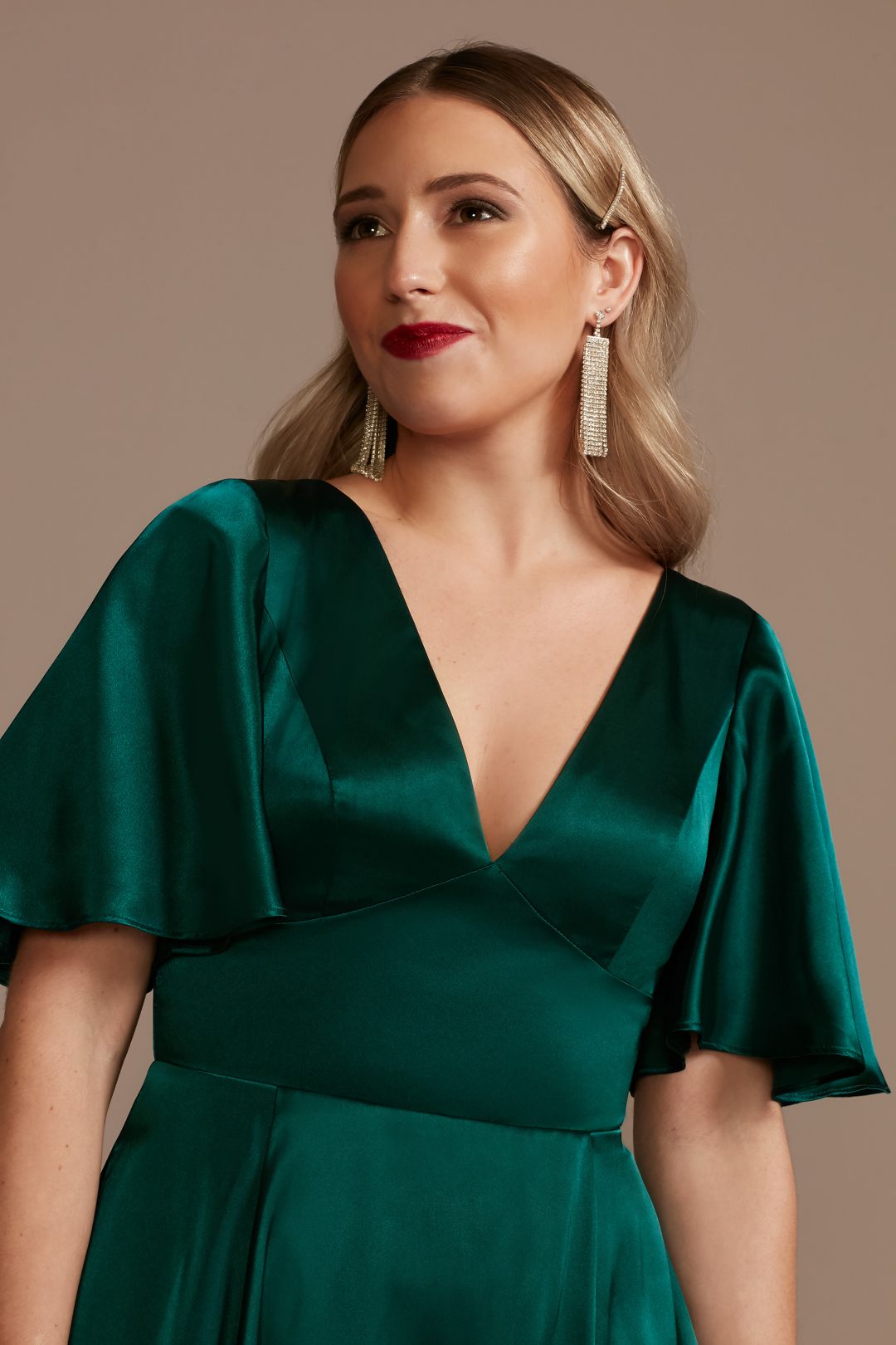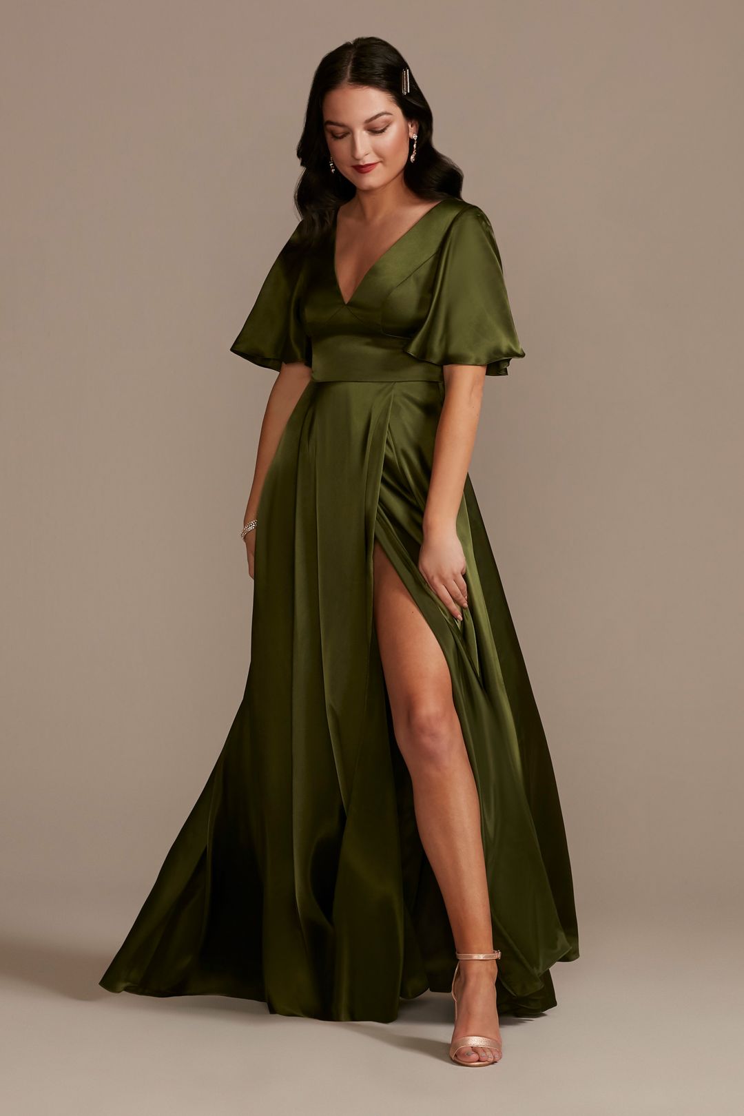 Este impactante vestido de dama confeccionado en charmeuse, te encantará. Sus mangas cortas y espectacular falda con abertura en pierna, te harán lucir espectacular. Cuenta con un escote redondo en espalda, que le dará un toque único a tu look.