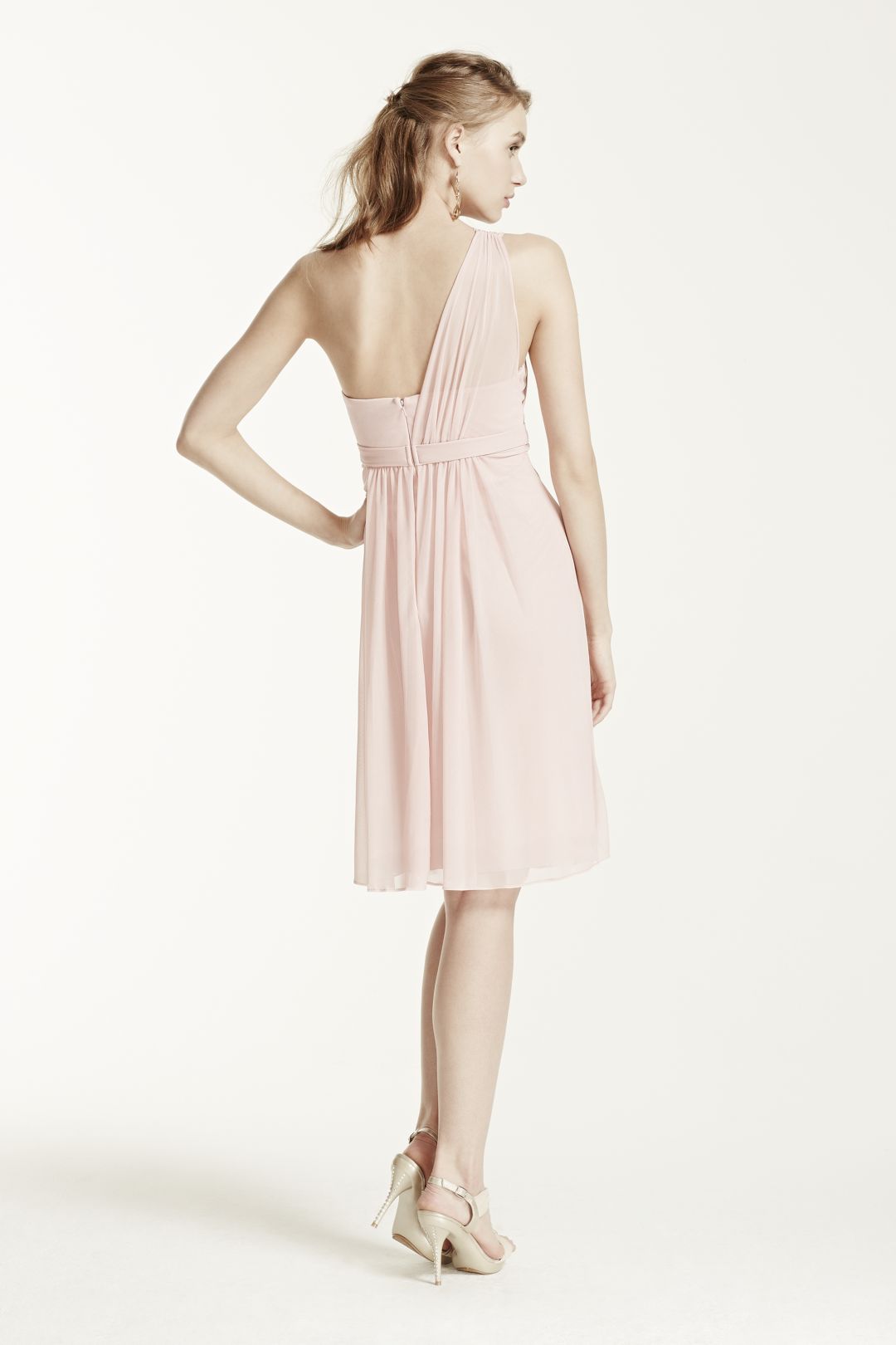 ¡Este hermoso vestido de dama corto te encantará! Su escote asimétrico en tul, se complementa perfecto con linda falda en línea A que favorecerá tu silueta.