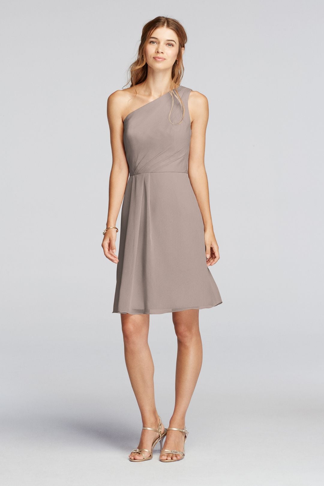 Vestido de dama corto con escote asimétrico y falda en línea A