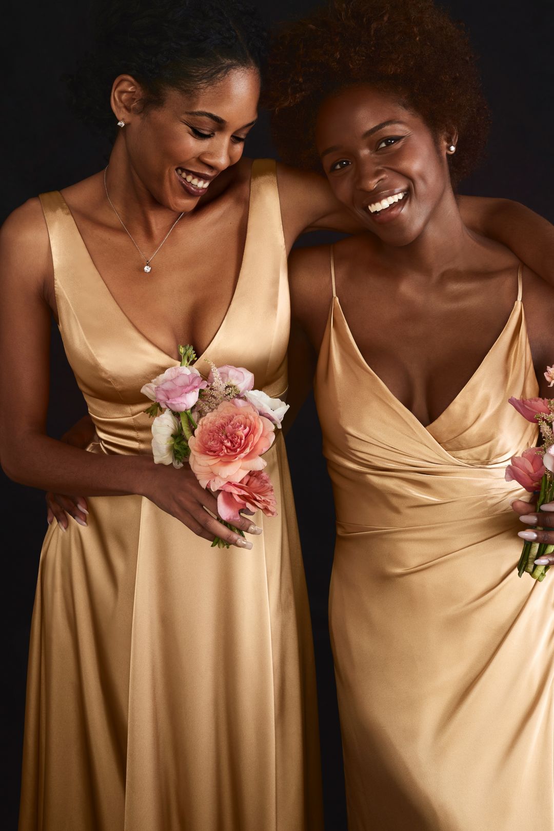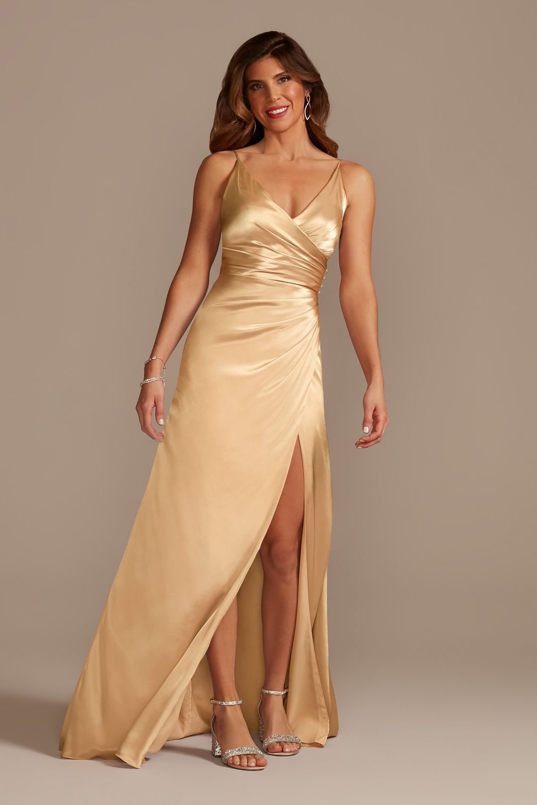 ¡Marca tendencia con este hermoso vestido de dama de satín! Su escote en V con tirantes estilizará tu figura. Se complementan con un delicado plisado en torso con botones laterales y una espectacular falda con abertura en pierna. Lucirás espectacular.