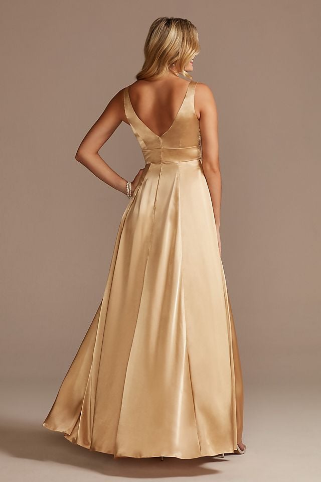 ¡Sé la más glamurosa con este hermoso vestido de dama satinado! Su sutil ecote en V en frente y espalda, se complementan con una espectacular falda con abertura en pierna, que te hará lucir espectacular.