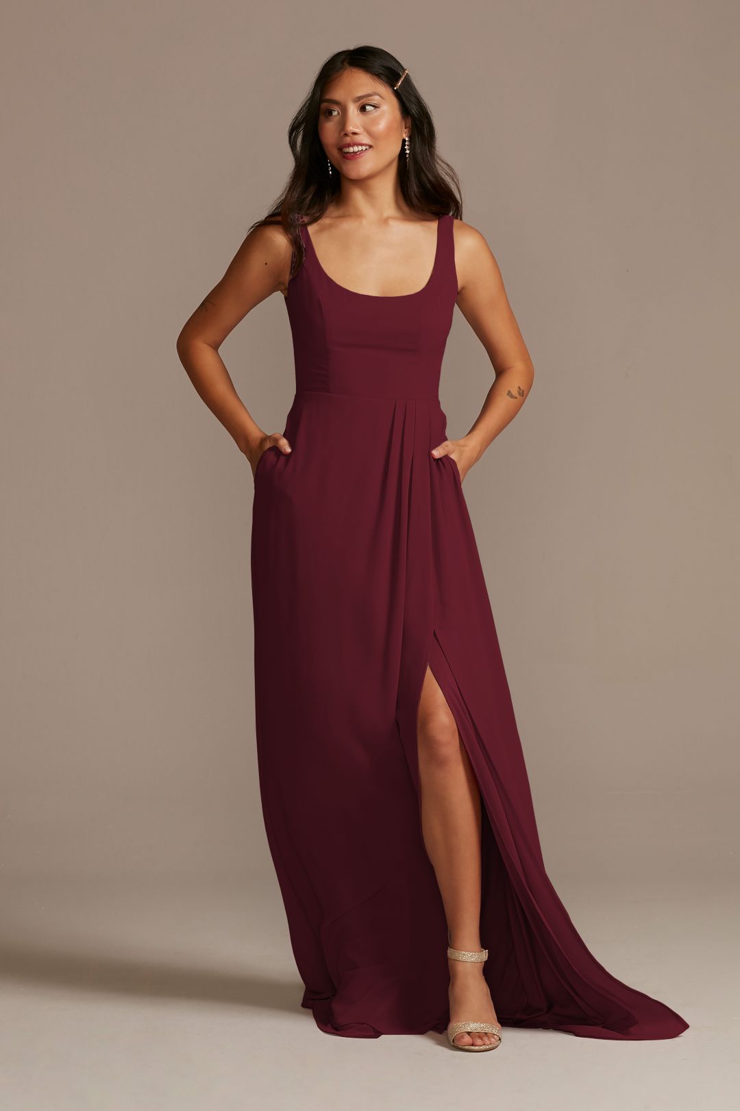 Luce radiante con este hermoso vestido de dama. Su escote redondo se complementa perfecto con una espalda convertible y una linda falda con abertura en pierna. Lucirás espectacular.