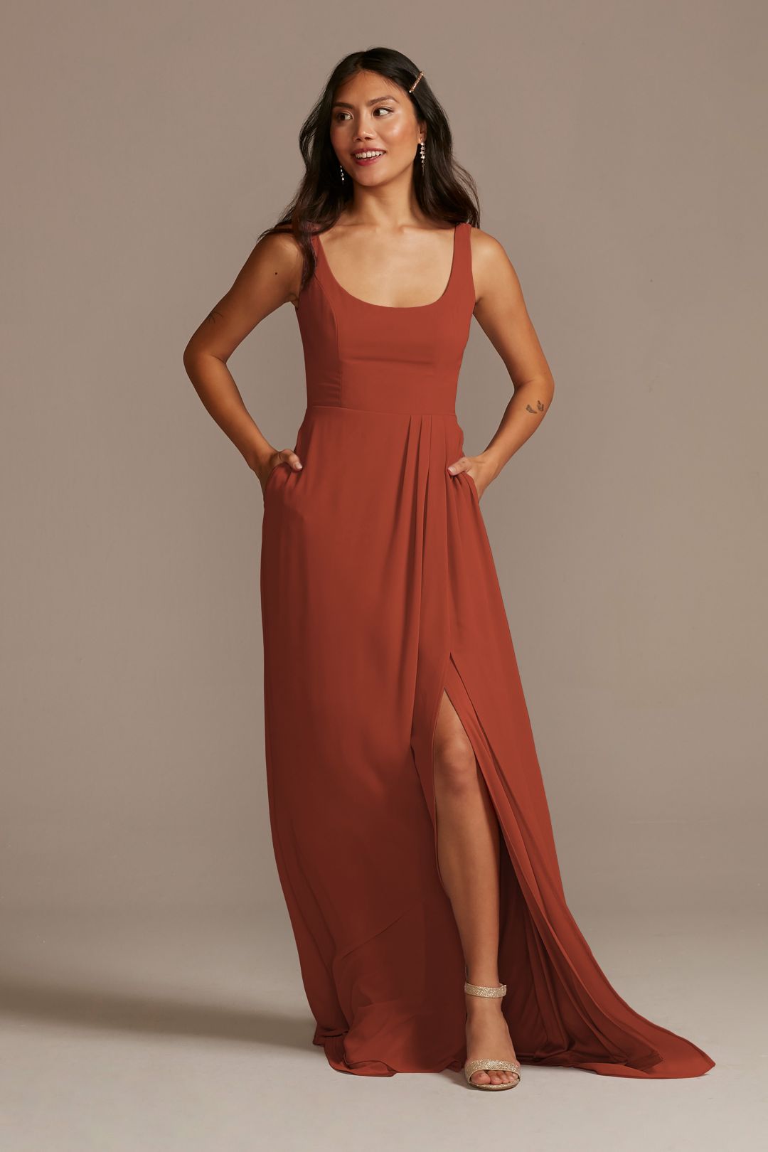 Luce radiante con este hermoso vestido de dama. Su escote redondo se complementa perfecto con una espalda convertible y una linda falda con abertura en pierna. Lucirás espectacular.
