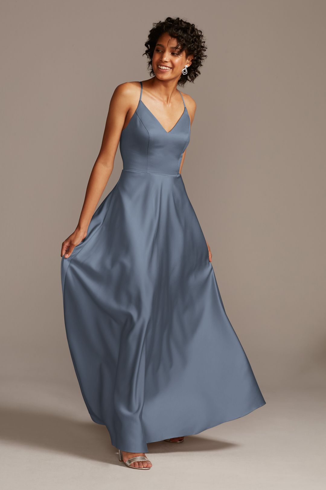 Luce elegante y en tendencia con este espectacular vestido de dama satinado. Su escote en V y tirantes ajustables cruzados en espalda, favorecerán tu figura. La hermosa falda en línea A, te dará movimiento y comodidad.