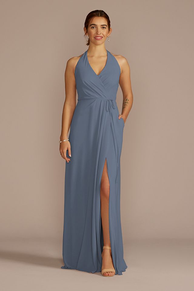 Destacarás con este vaporoso vestido de dama de chifón con escote halter y abertura en pierna.