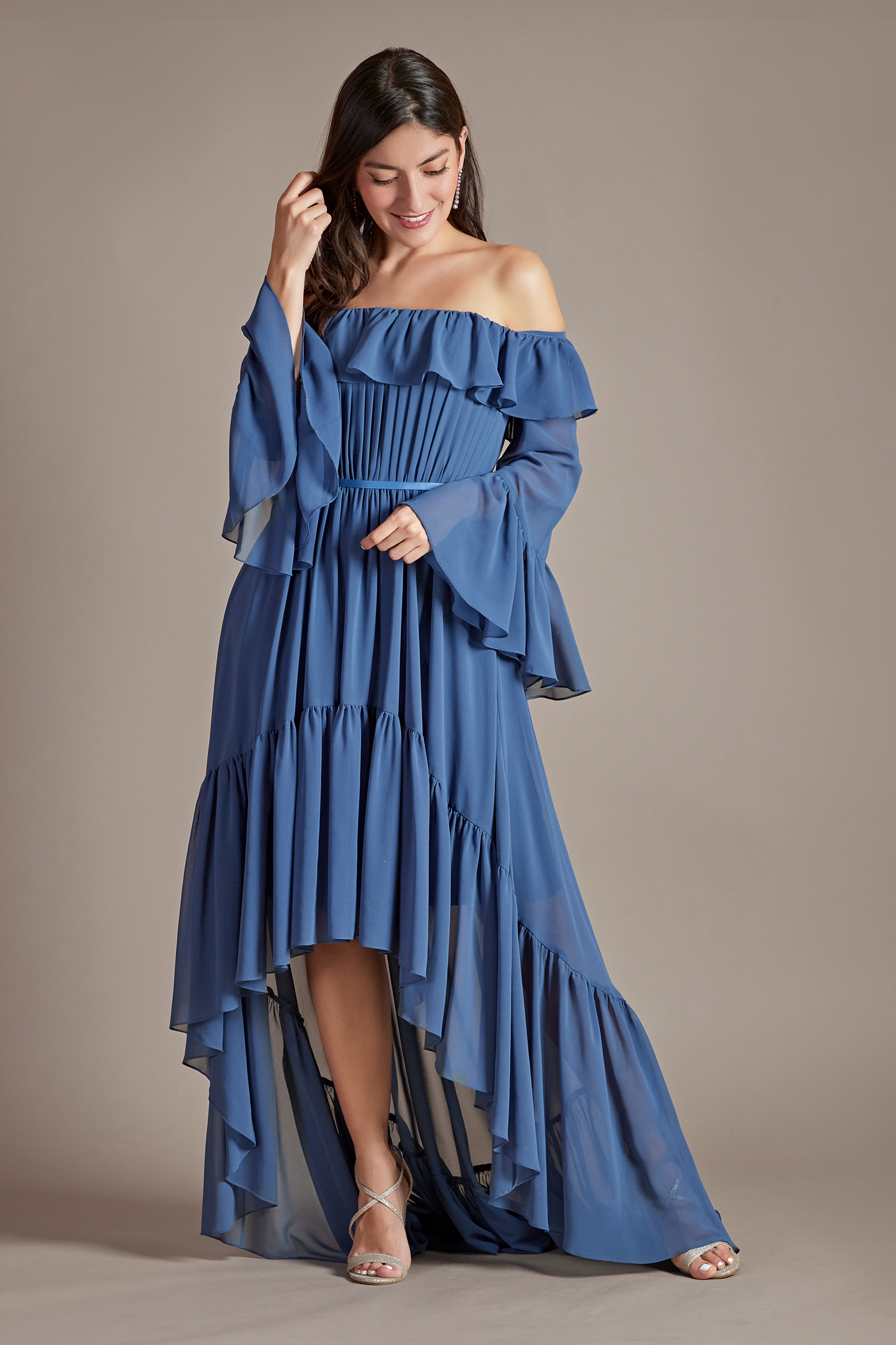 Roba suspiros con este hermoso vestido asimétrico de chifón con mangas largas al hombro y silueta recta. Sus delicados olanes y listón satinado en cintura, te harán lucir espectacular.