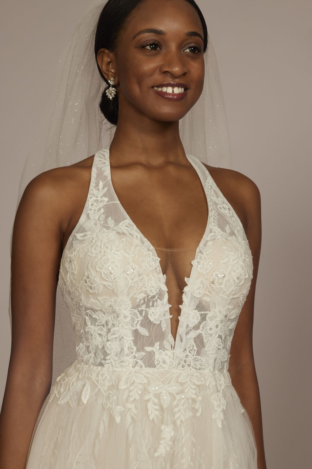 Este increíble vestido de novia halter en línea A te hará lucir espectacular. Su corset con transparencia y escote ilusión profundo, está decorado con bellas aplicaciones florales y sutiles toques de brillo. La falda confeccionada en delicado encaje y varias capas de tul, tiene una abertura lateral en la pierna que te hará lucir un look único en tu gran día.