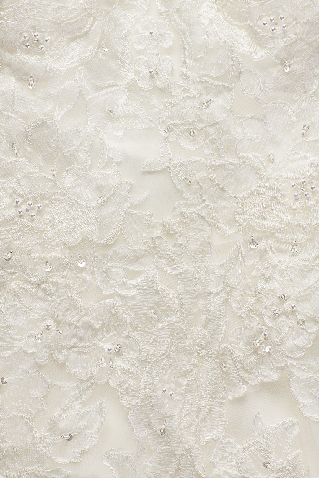 Este hermoso y clásico vestido de novia en línea A, cuenta con aplicaciones de pequeñas perlas y cristales que le dan un toque de brillo al corset. Su hermosa falda adornada con encaje 3D, se complementa con la delicada espalda ilusión con botones. Lucirás espectacular en tu gran día.