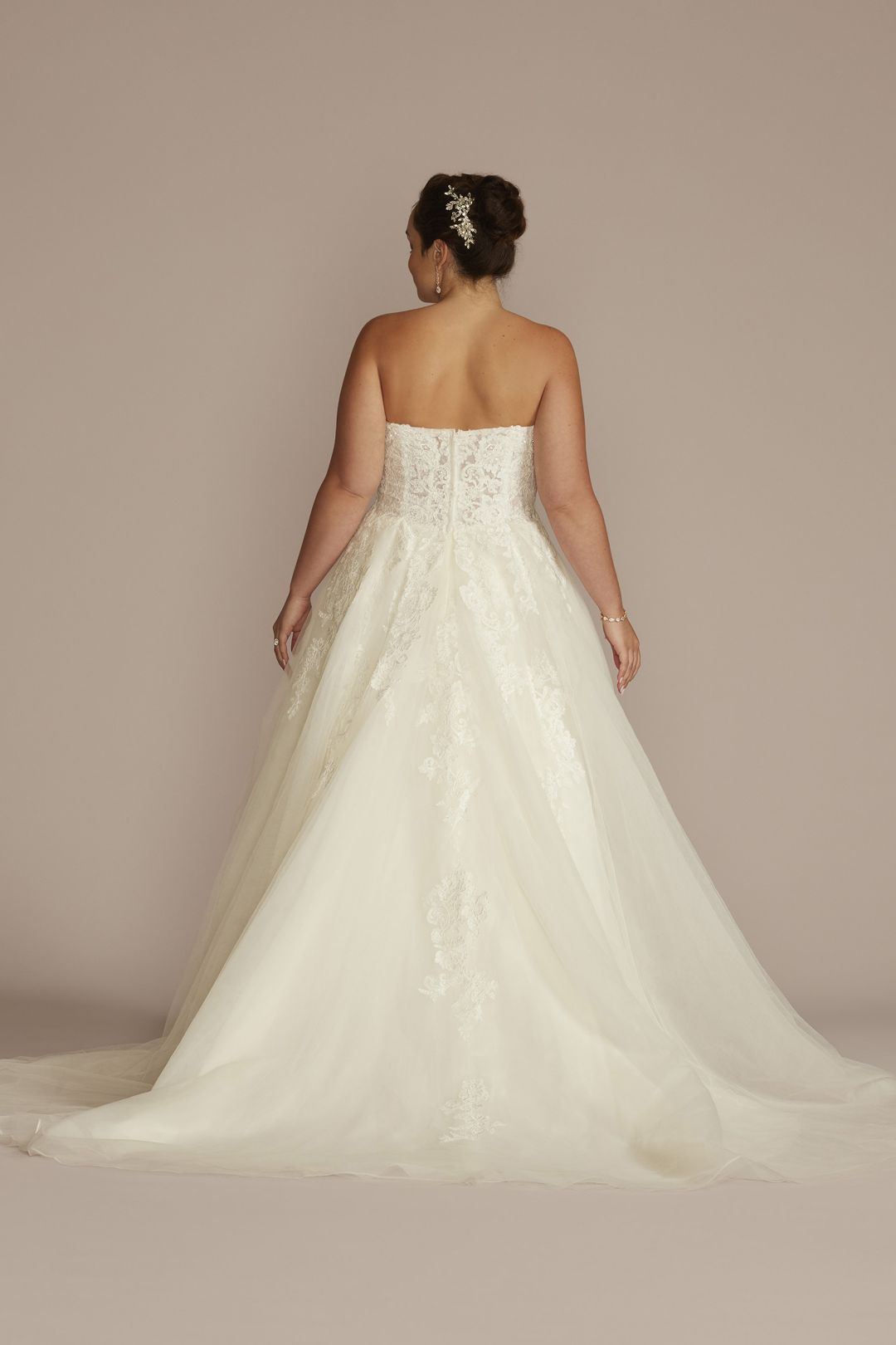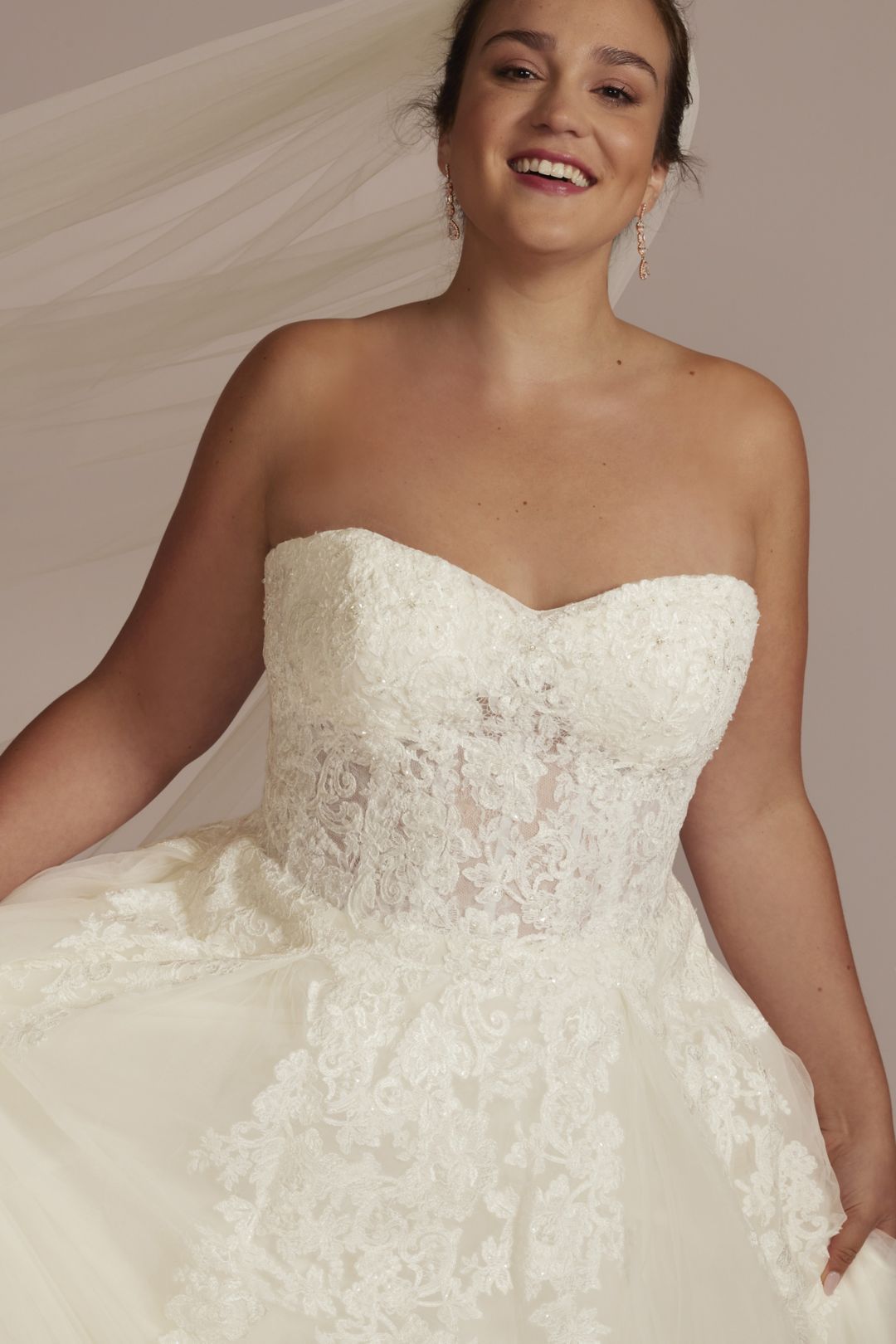 Este precioso vestido de novia princesa strapless es la definición del romanticismo. Las varillas del corset y aplicaciones de encaje que van desde el toso hacia la falda, afinarán tu cintura, creando una silueta más estilizada.