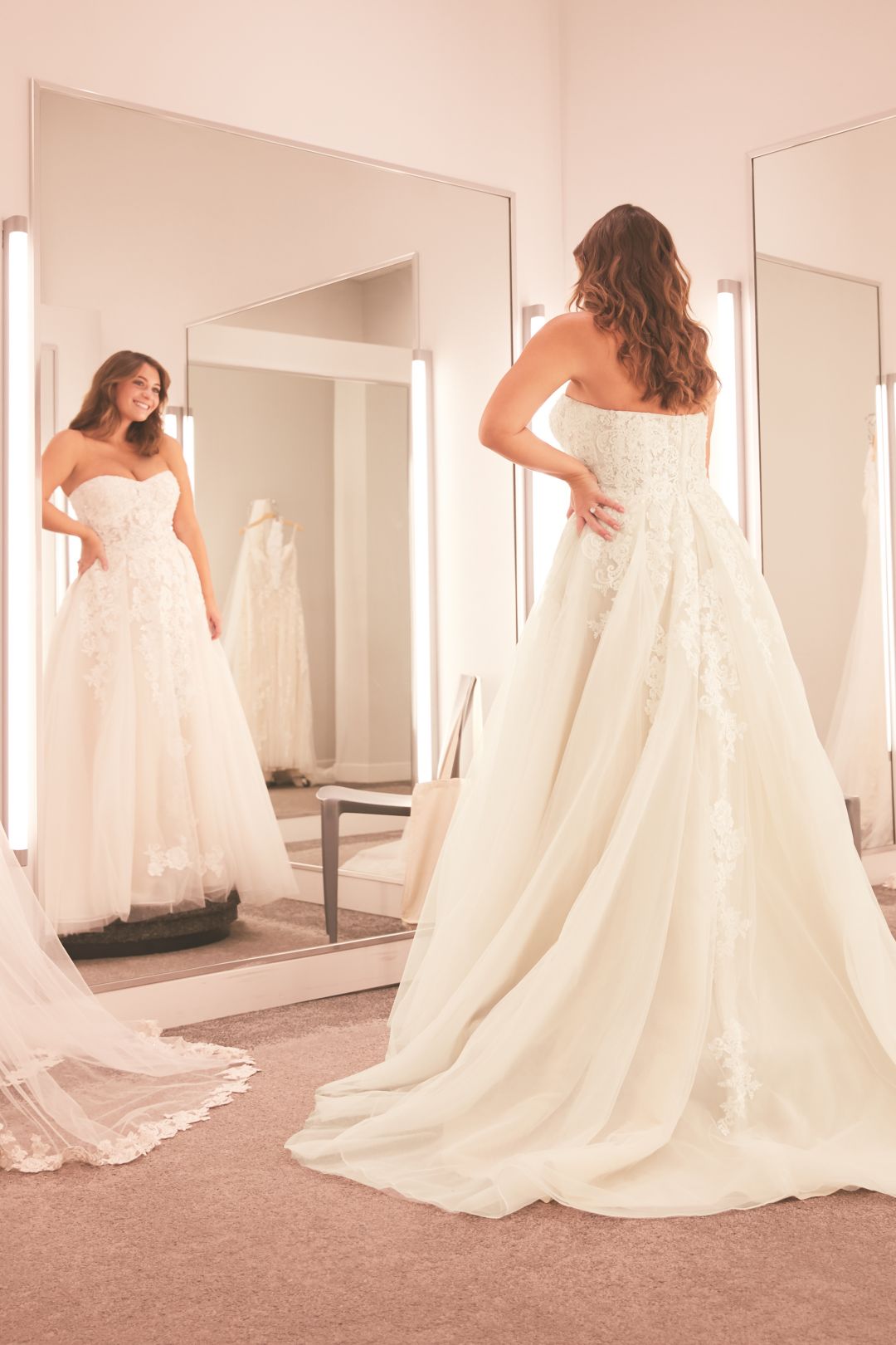 Este precioso vestido de novia princesa strapless es la definición del romanticismo. Las varillas del corset y aplicaciones de encaje que van desde el toso hacia la falda, afinarán tu cintura, creando una silueta más estilizada.