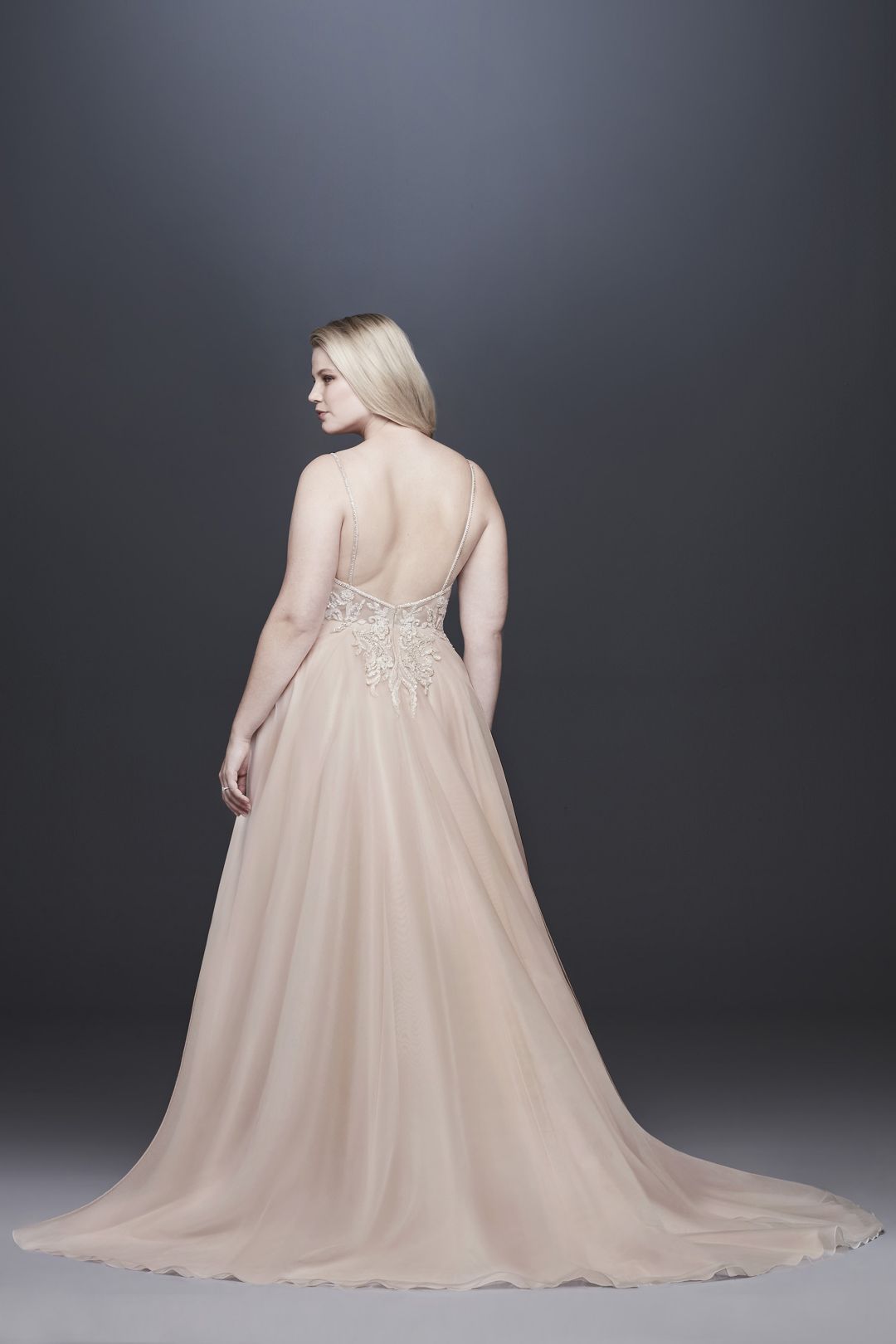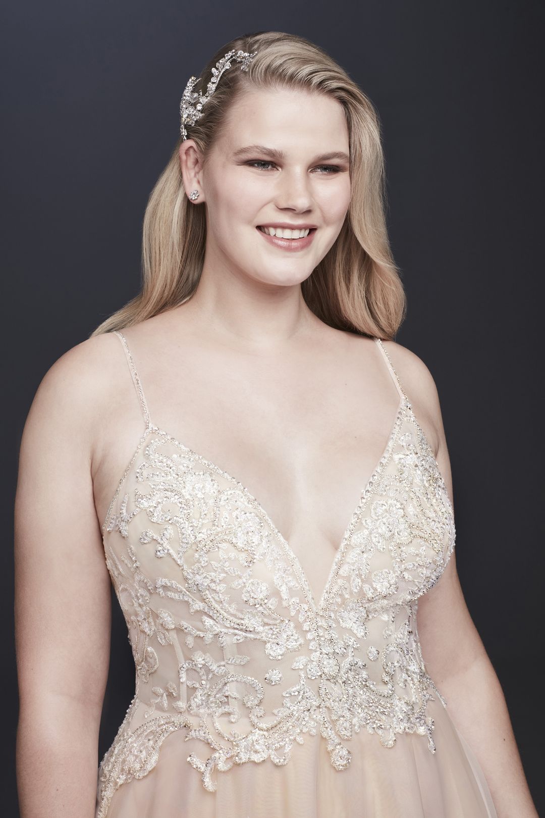 Realizado con más de 5,000 cristales, cuentas y lentejuelas delicadamente colocados a mano, este hermoso vestido de novia línea A, es un sueño hecho realidad. Creado para novia atrevida y en tendencia, el brillante corset con escote profundo en V y espalda descubierta, alargará tu torso y te hará lucir espectacular en tu gran día.