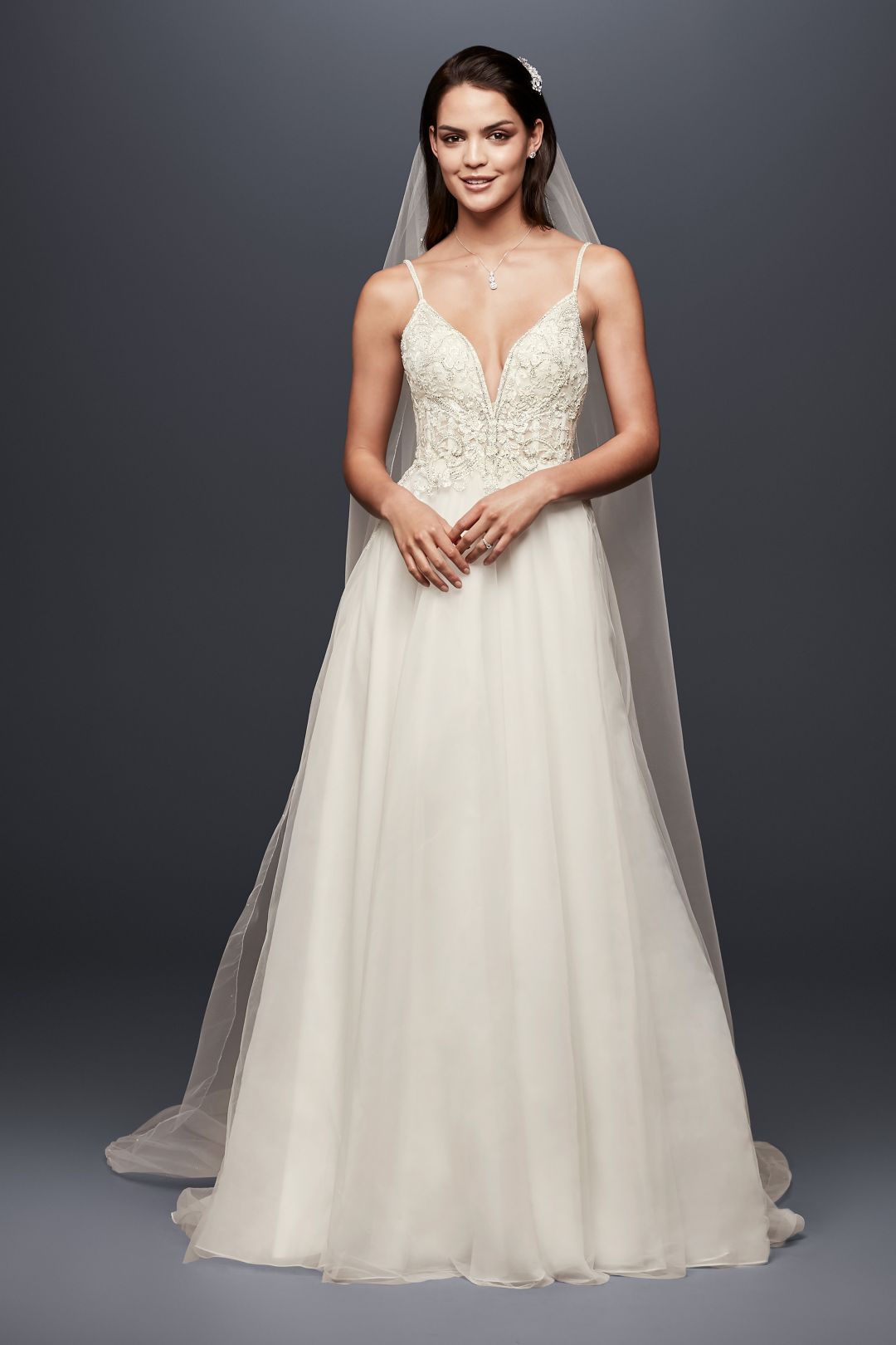 Realizado con más de 5,000 cristales, cuentas y lentejuelas delicadamente colocados a mano, este hermoso vestido de novia línea A, es un sueño hecho realidad. Creado para novia atrevida y en tendencia, el brillante corset con escote profundo en V y espalda descubierta, alargará tu torso y te hará lucir espectacular en tu gran día.