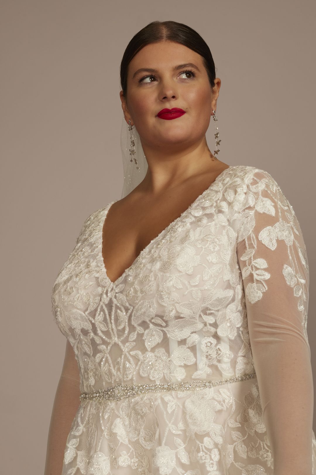 Desde el cinturón con cuentas de cristal hasta los botones de joya en la espalda ilusión, este cautivador vestido de novia de manga larga es un sueño hecho realidad. Las varillas y transparencias en el corset, así como su pronunciado escote en V, estilizarán tu figura. La falda en tonalidades rosa le dan un delicado toque de color, y los brillantes apliques de encaje y lentejuelas en la falda, te harán lucir espectacular en tu gran día.