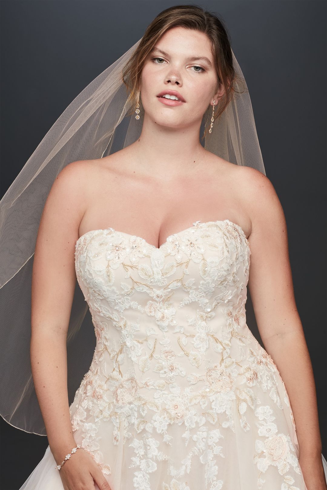 Este hermoso vestido de novia princesa con un tenue color rosa, es la definición de romanticismo puro. Su delicado encaje con pedrería y aplicaciones florales en corset y falda, te harán sentir como en un sueño hecho realidad.