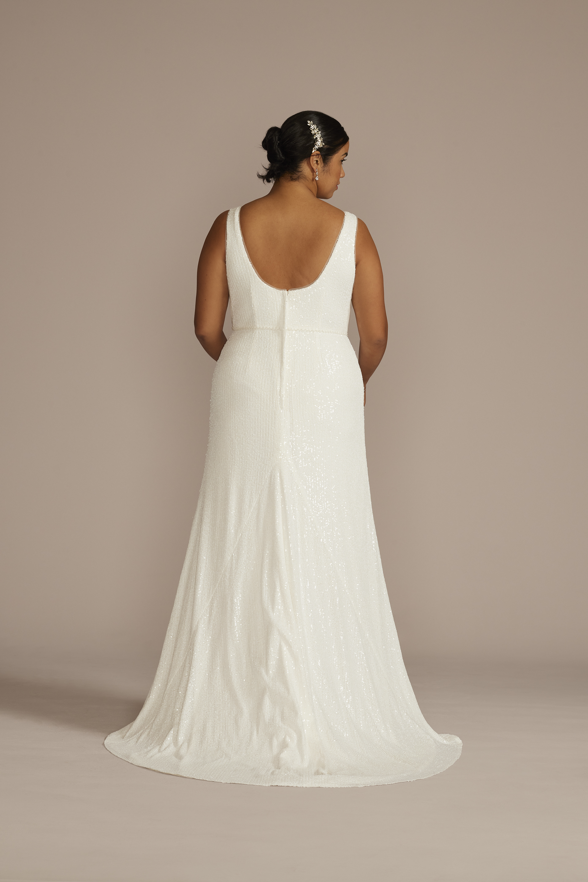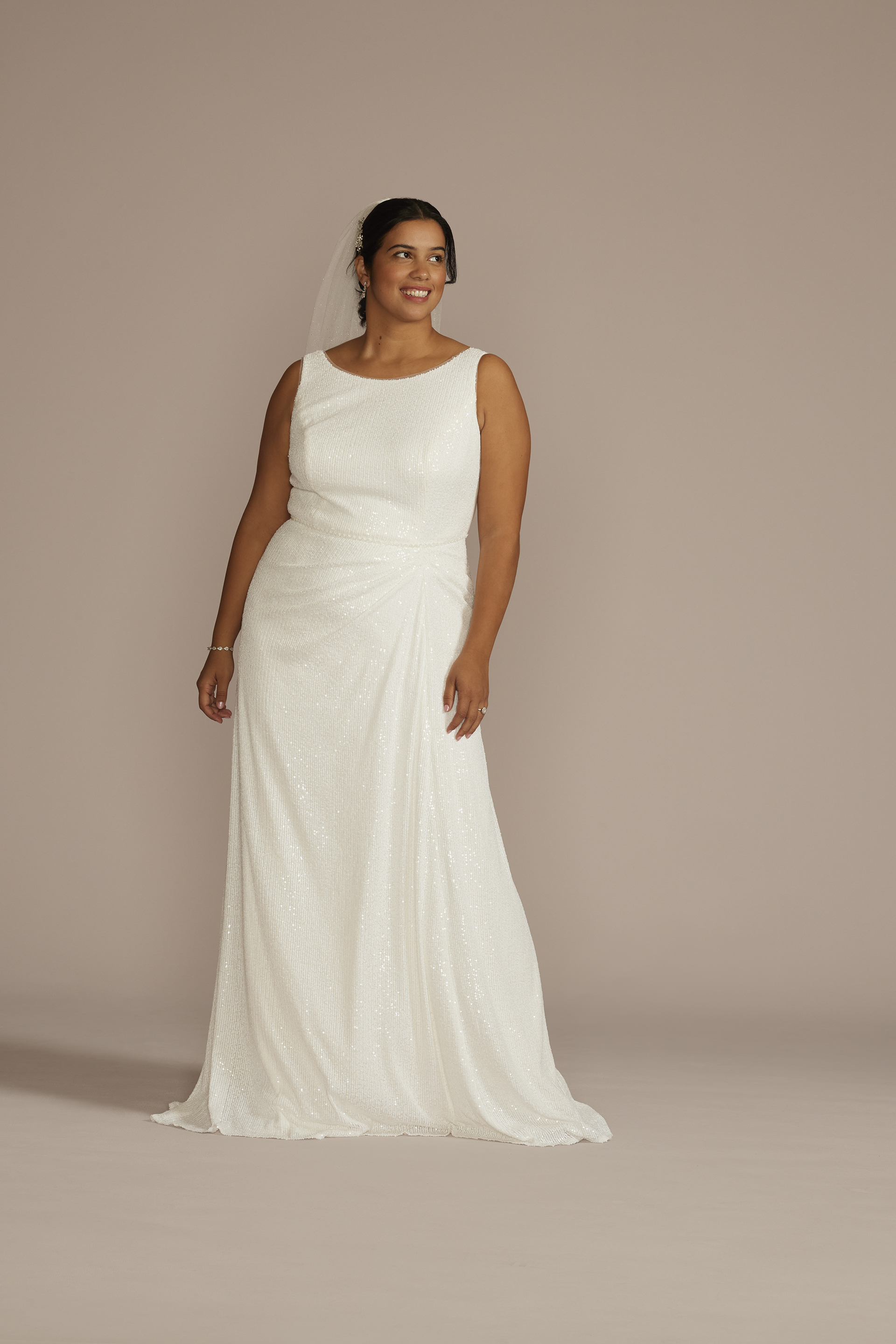 Enamórate de este increíble vestido de novia marfil con lentejuelas tornasol. Su ligero drapeado en cadera y escote redondo, te harán lucir espectacular en tu gran día.