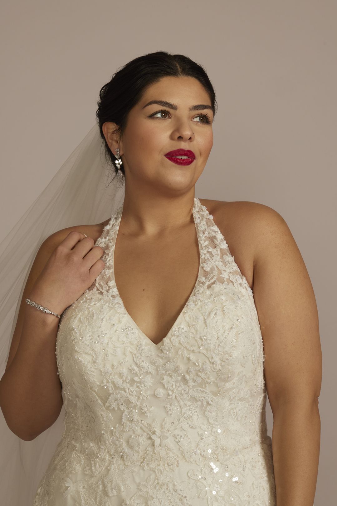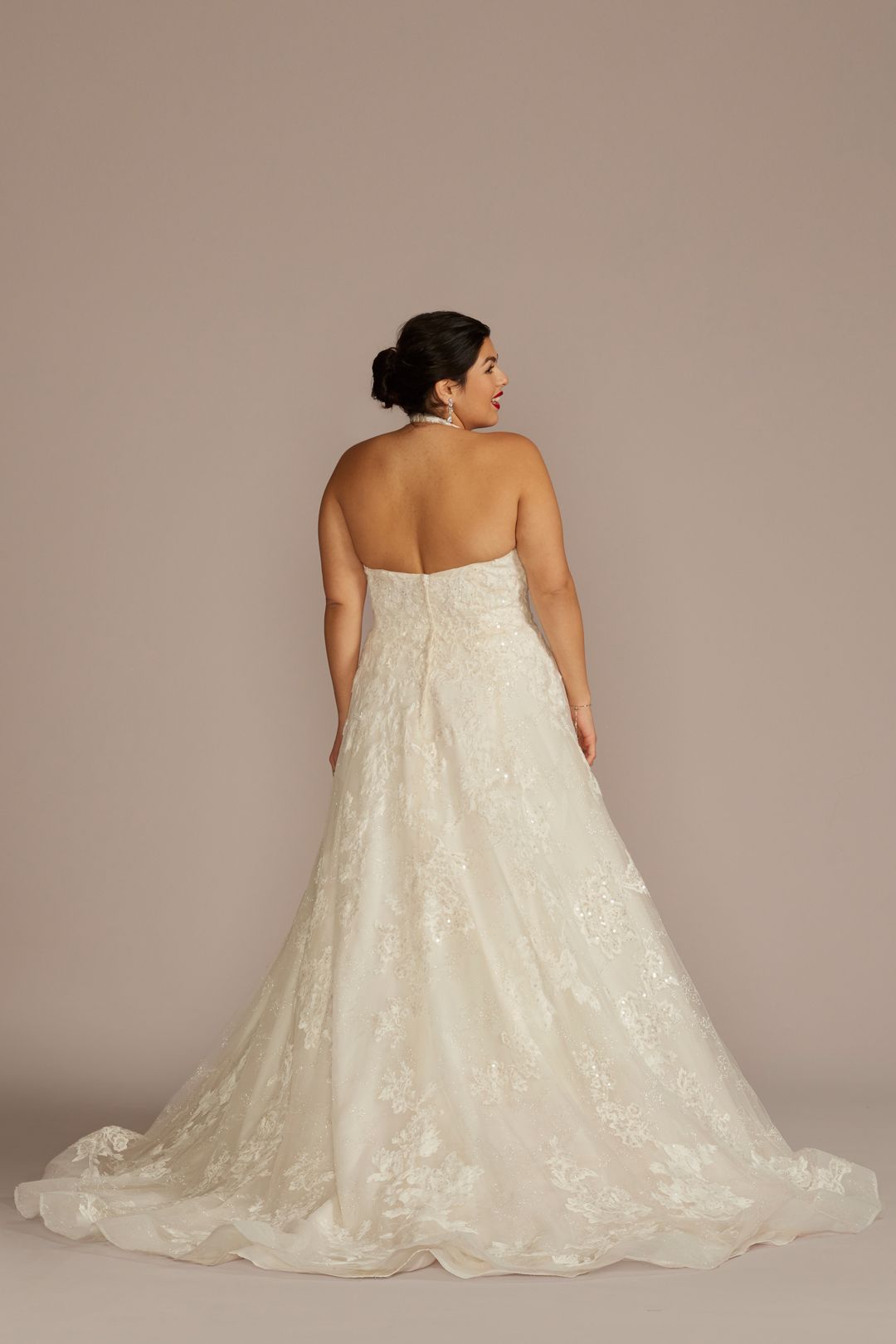 Lucirás hermosa con este vestido de novia de delicado encaje con cuentas. El cautivador escote halter aporta un elemento romántico, sobre una falda de tul adornada con increíbles aplicaciones. Completa el look atemporal con un elegante cauda.