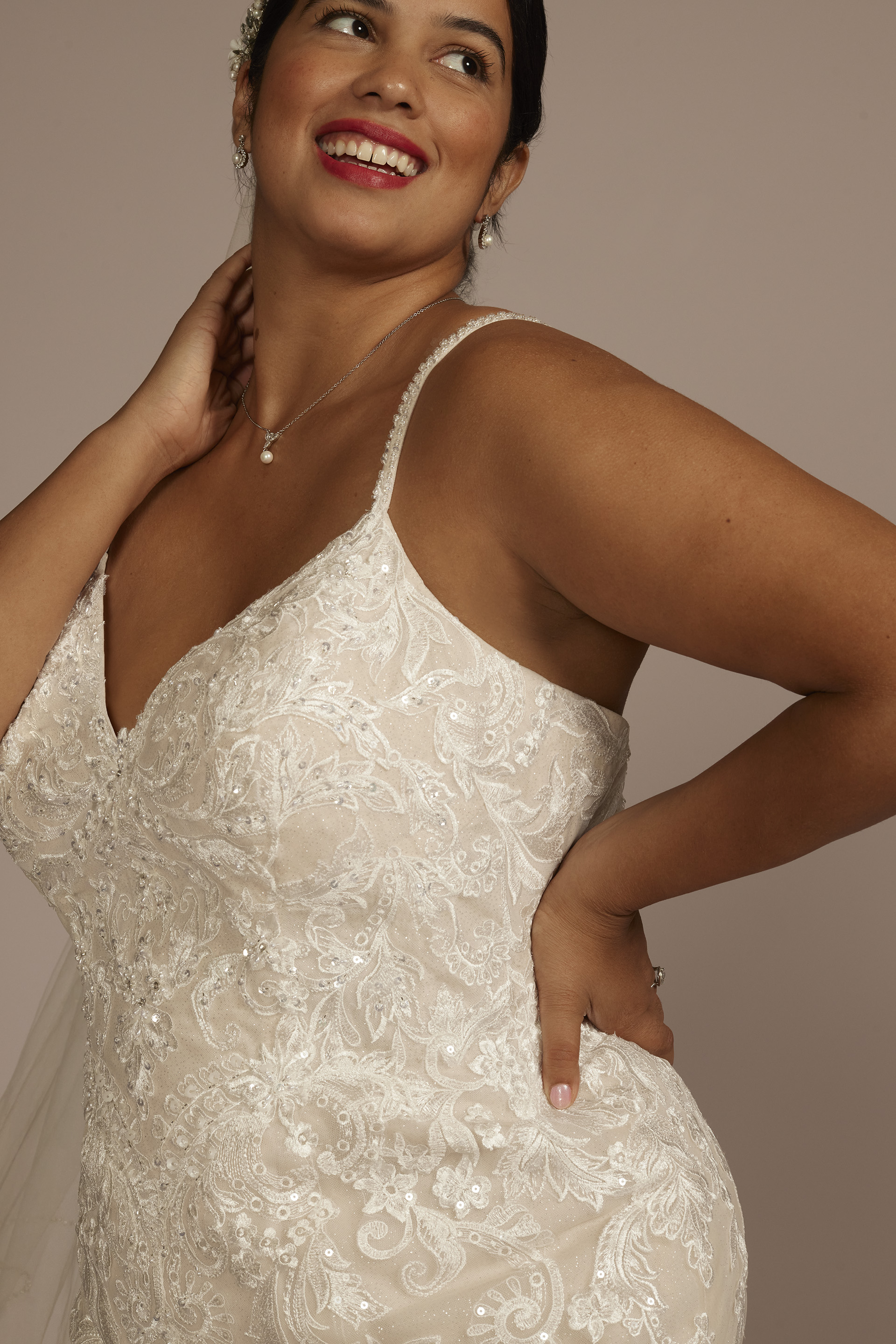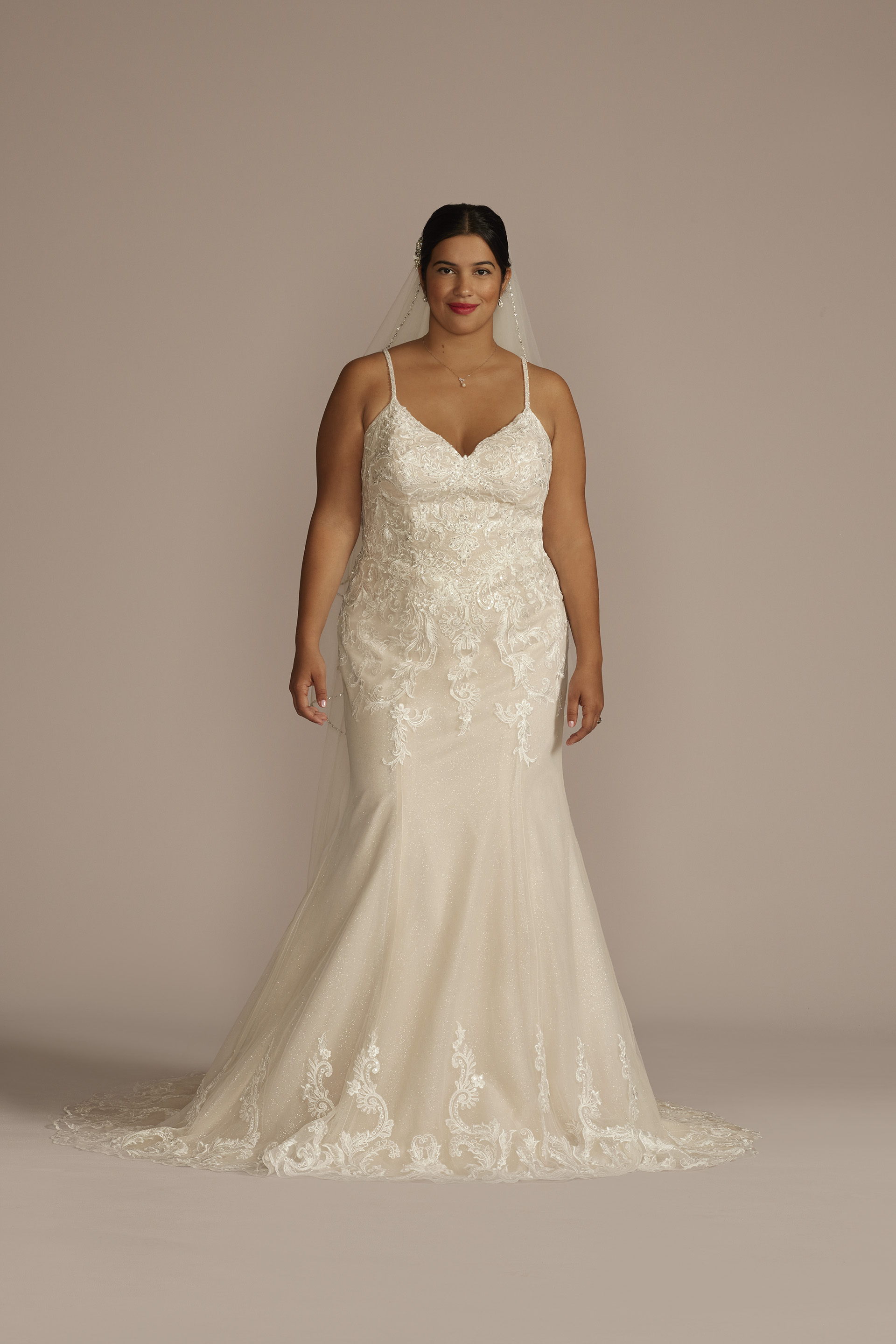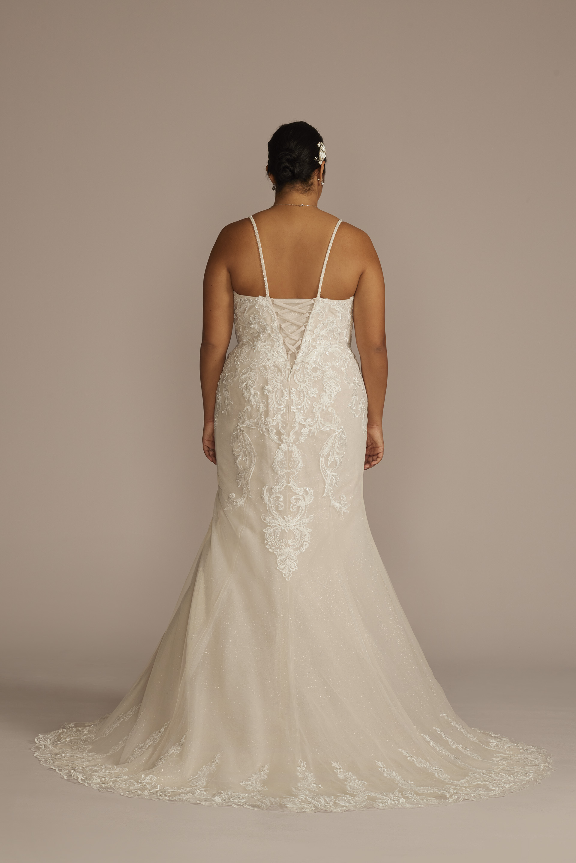 Este vestido de novia es digno de asombro. Está adornado con románticas aplicaciones de encaje en el corset, cintura y en su larga cauda. Detalles favorecedores como tirantes finos y cordones ajustables, son la combinación perfecta para resaltar tu figura con su favorecedora silueta sirena.