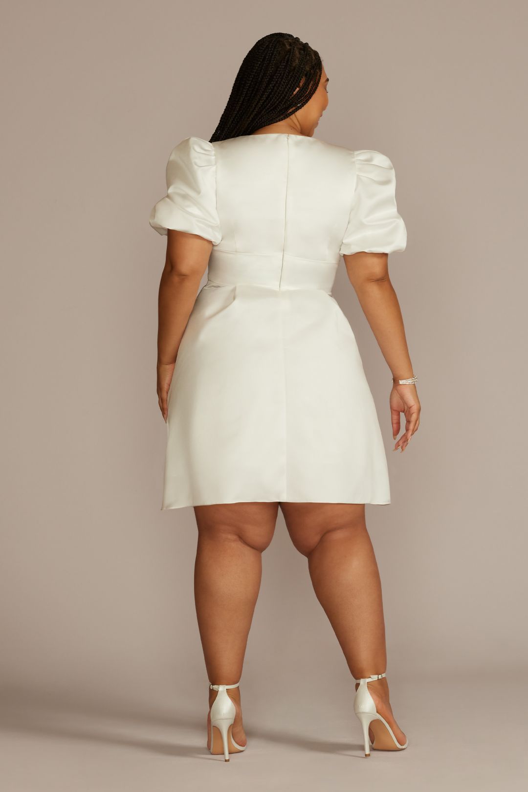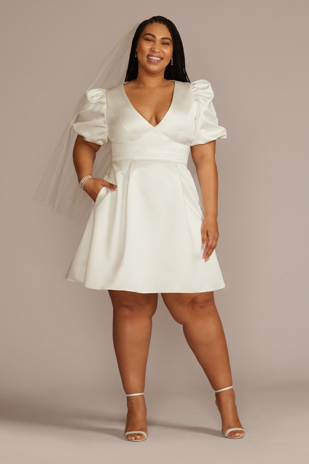 Este vestido de novia corto satinado es perfecto para tu cena de compromiso o despedida de soltera. Las mangas abullonadas y el profundo escote en V favorecerán tu silueta. Cuenta con bolsillos laterales para que nunca guardes tu celular o lipstick.