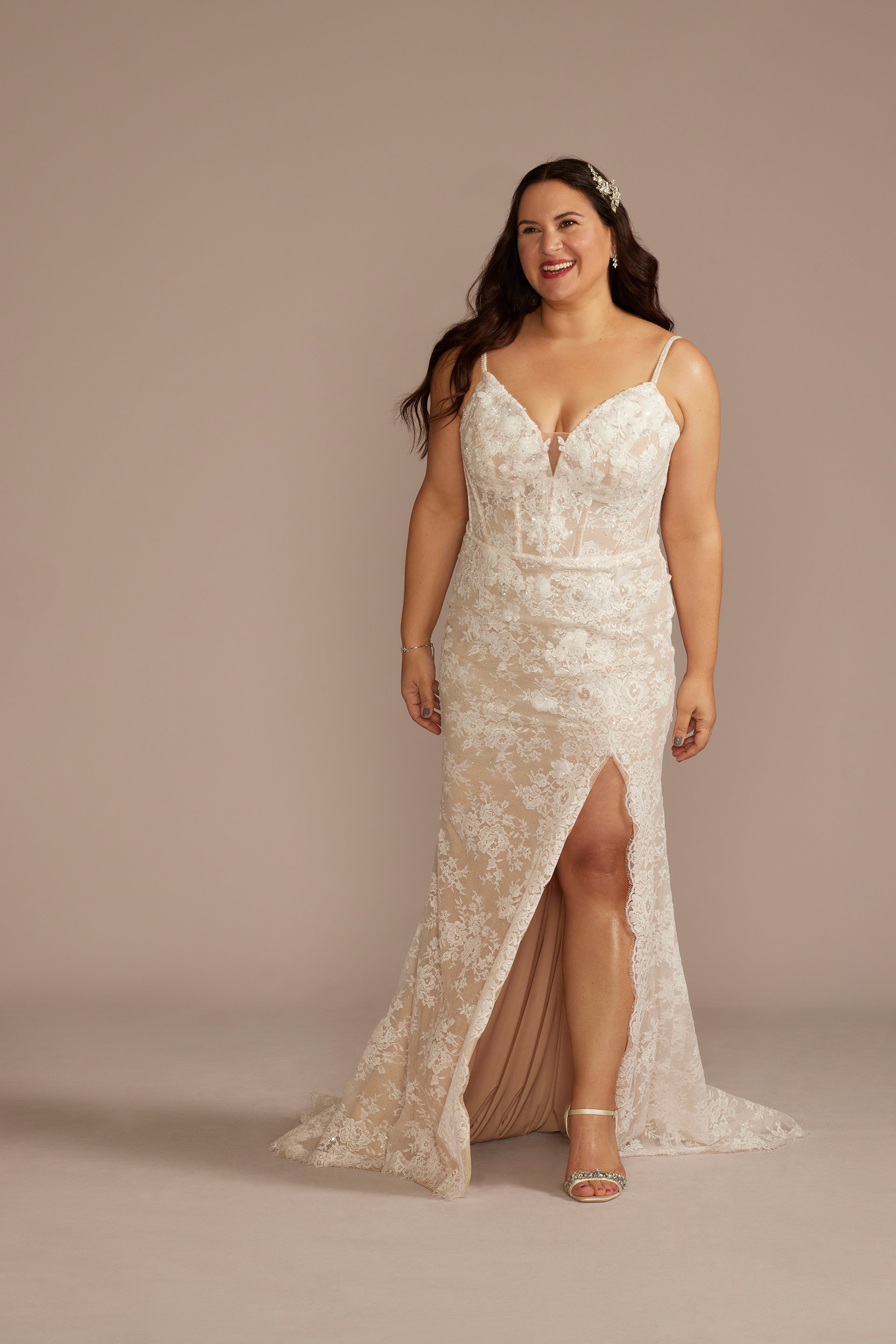 Este hermoso vestido de novia de encaje con escote ilusión, es la definición de elegancia. Sus tirantes ajustables y abertura lateral, lo hacen perfecto para la novia moderna que busca un toque de romanticismo para el gran día.