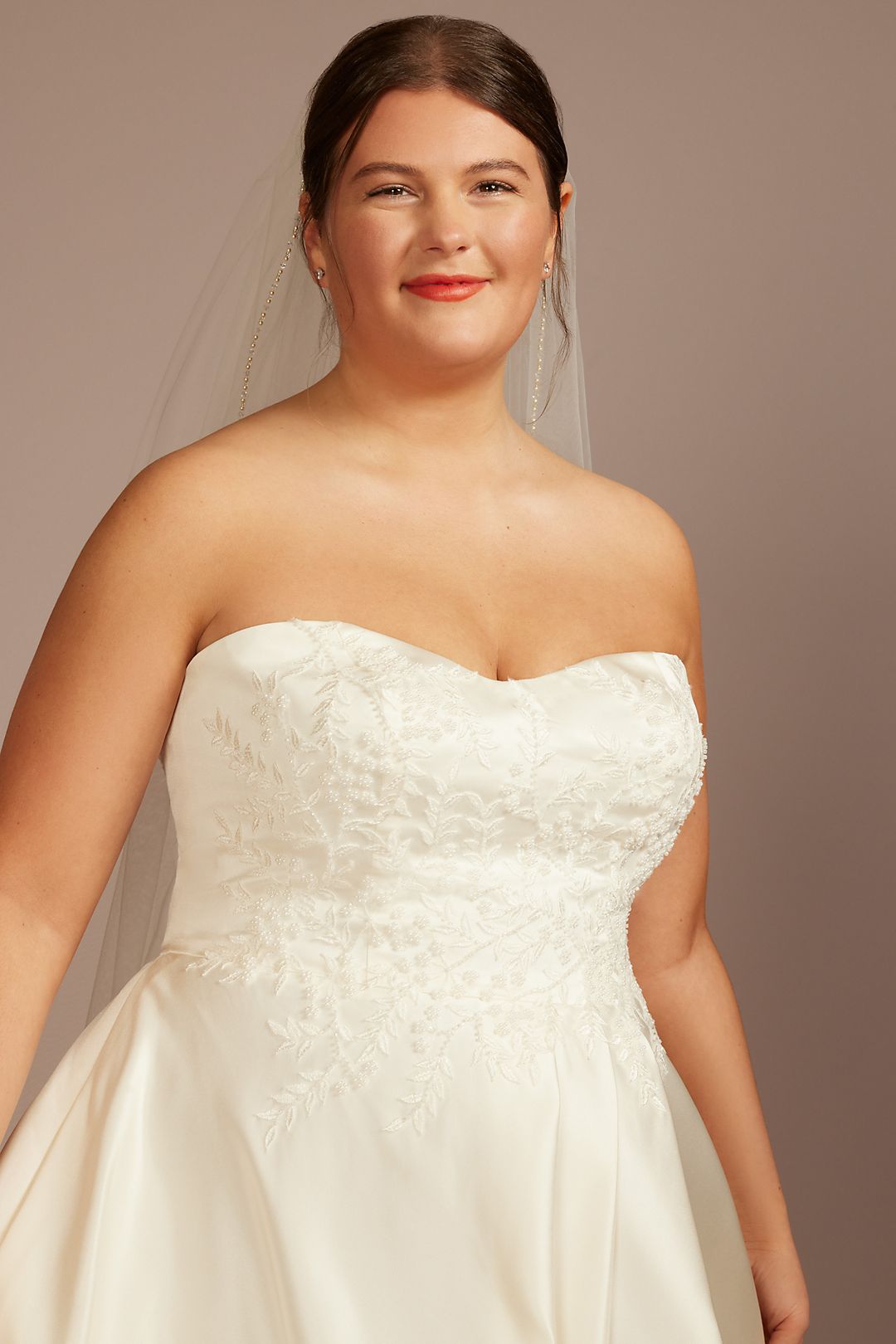 La brillante falda en satín de este hermoso vestido de novia corte línea A, es ideal para la novia elegante. El delicado encaje en el corset con escote recto, le dará un toque único a tu look nupcial.