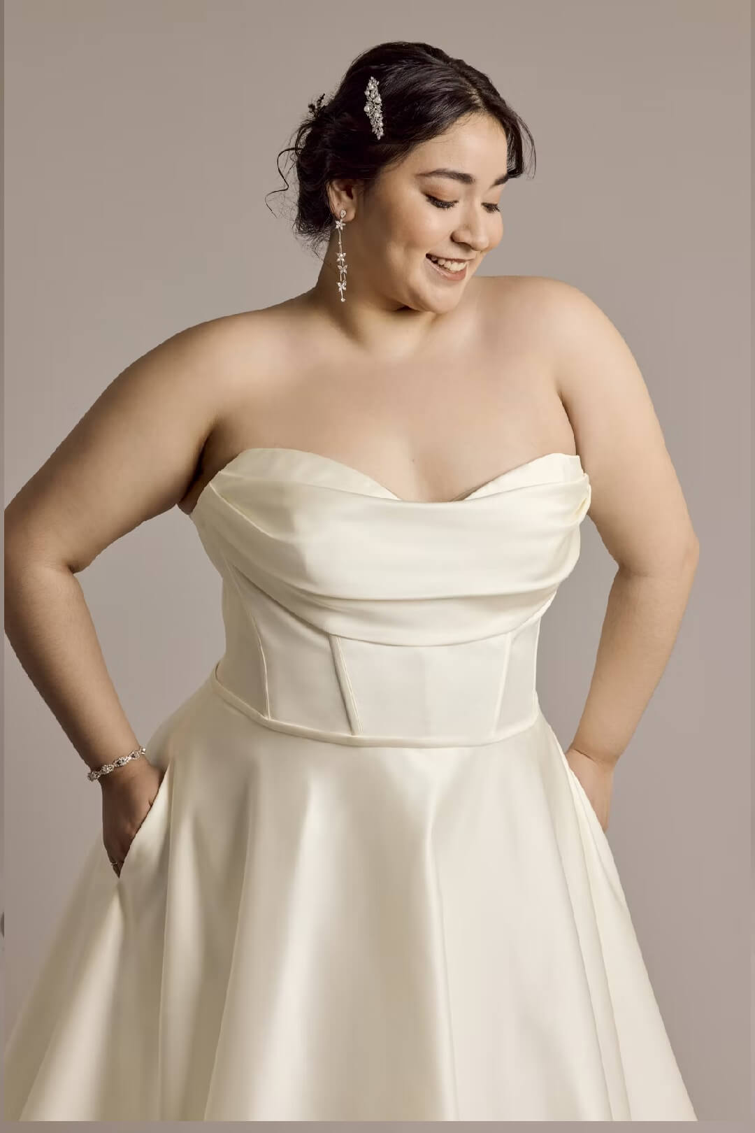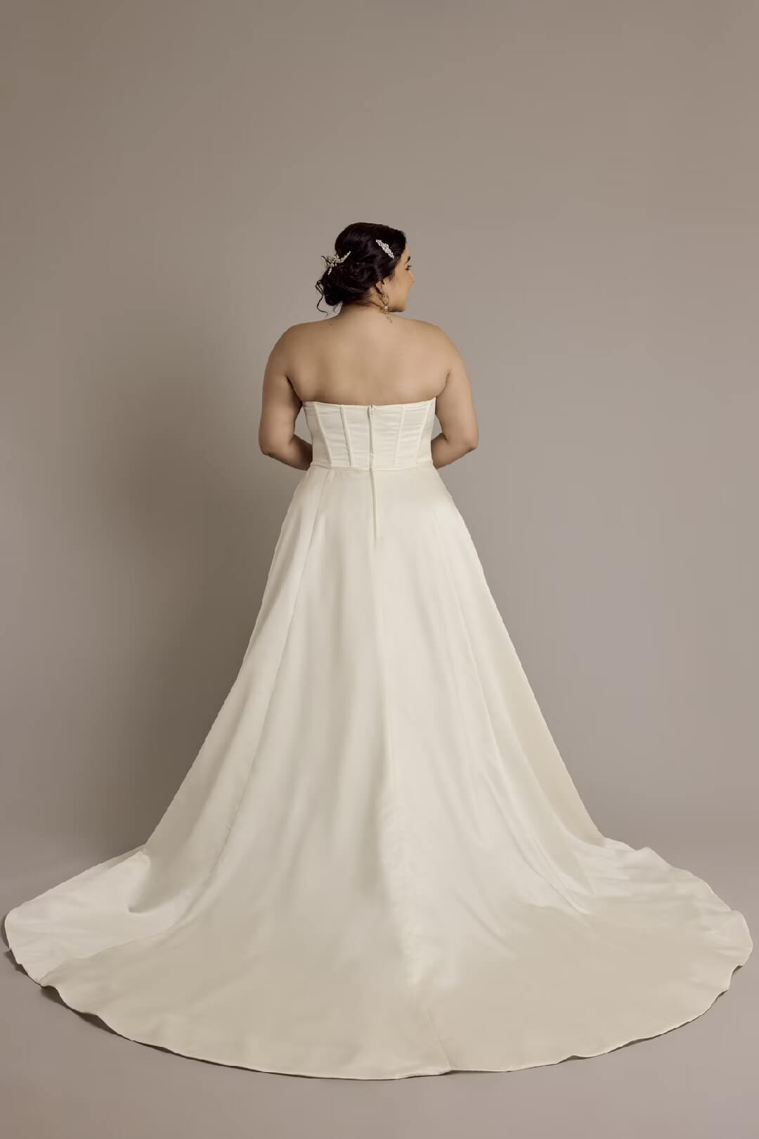 Deléitate con la elegancia de este vestido satinado . Con un moderno escote y una elegante y llamativa cauda, este vestido de novia irradia un lujo discreto. Los detalles del corset realzan tu figura.
