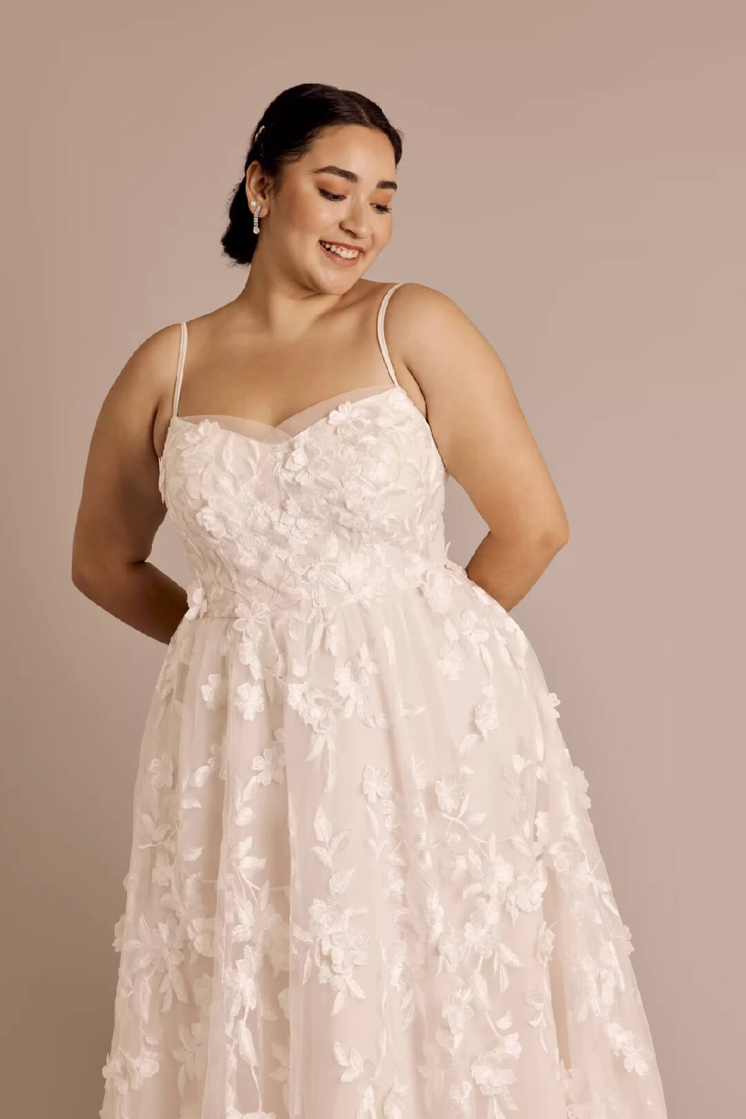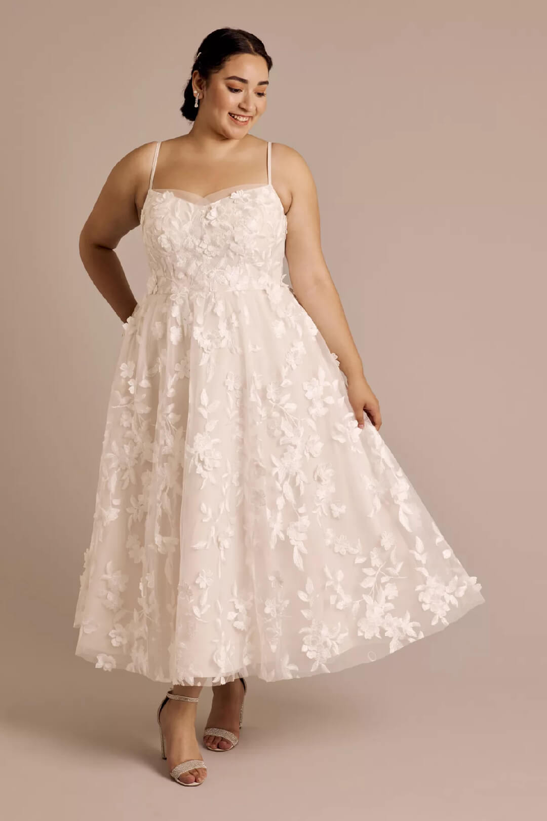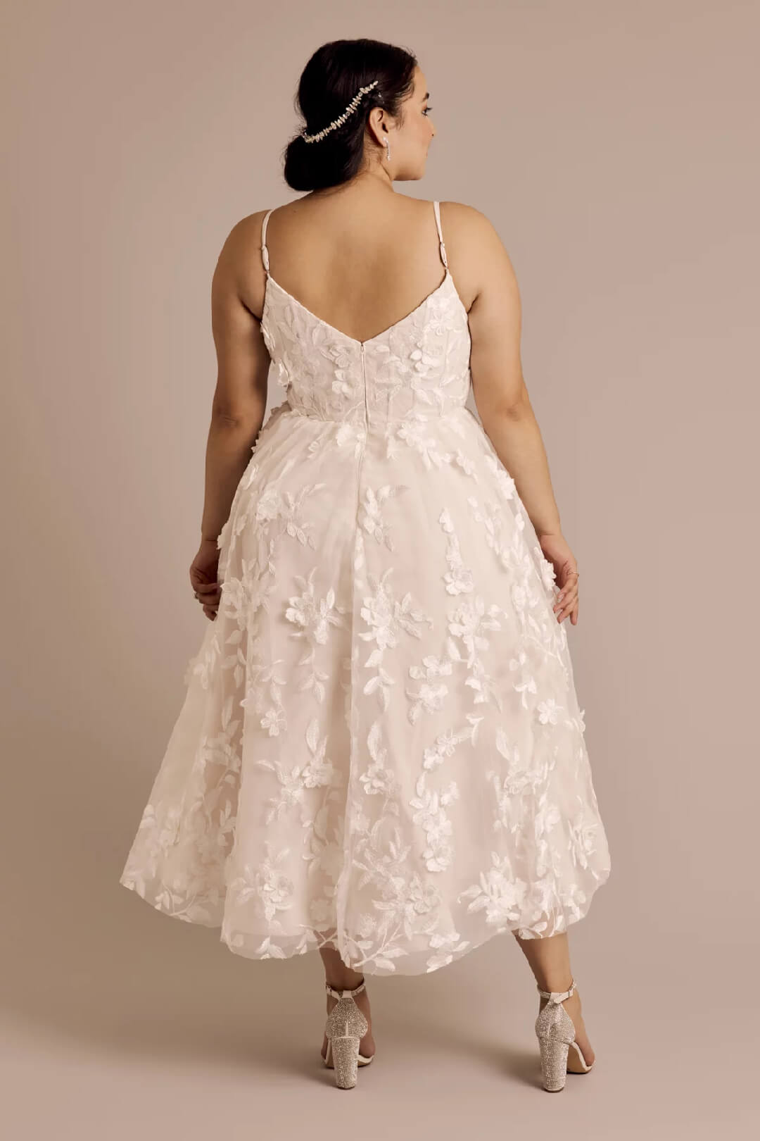 Este vestido midi con flores en 3D y tirantes finos es ideal para celebrar tu gran día o evento nupcial.