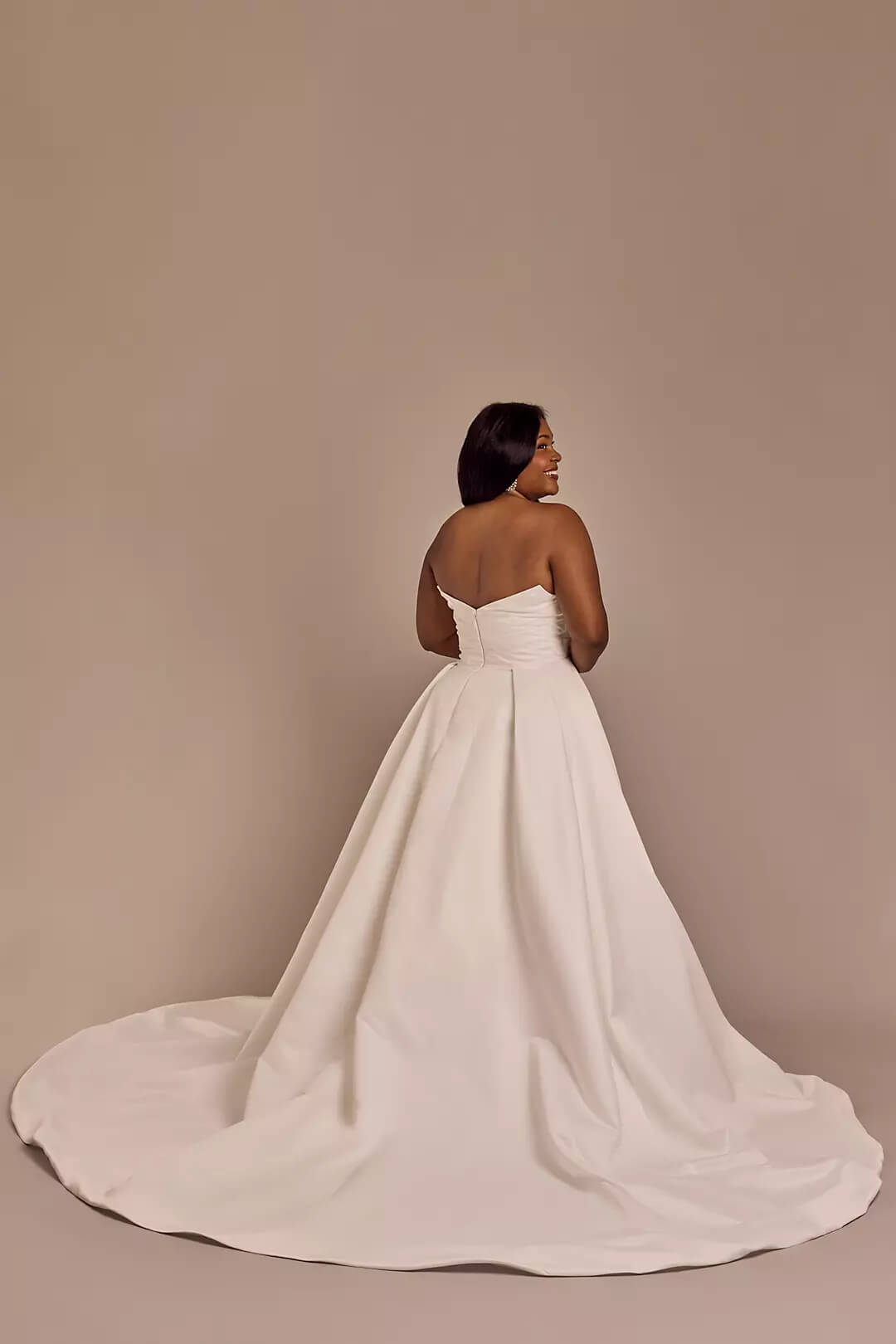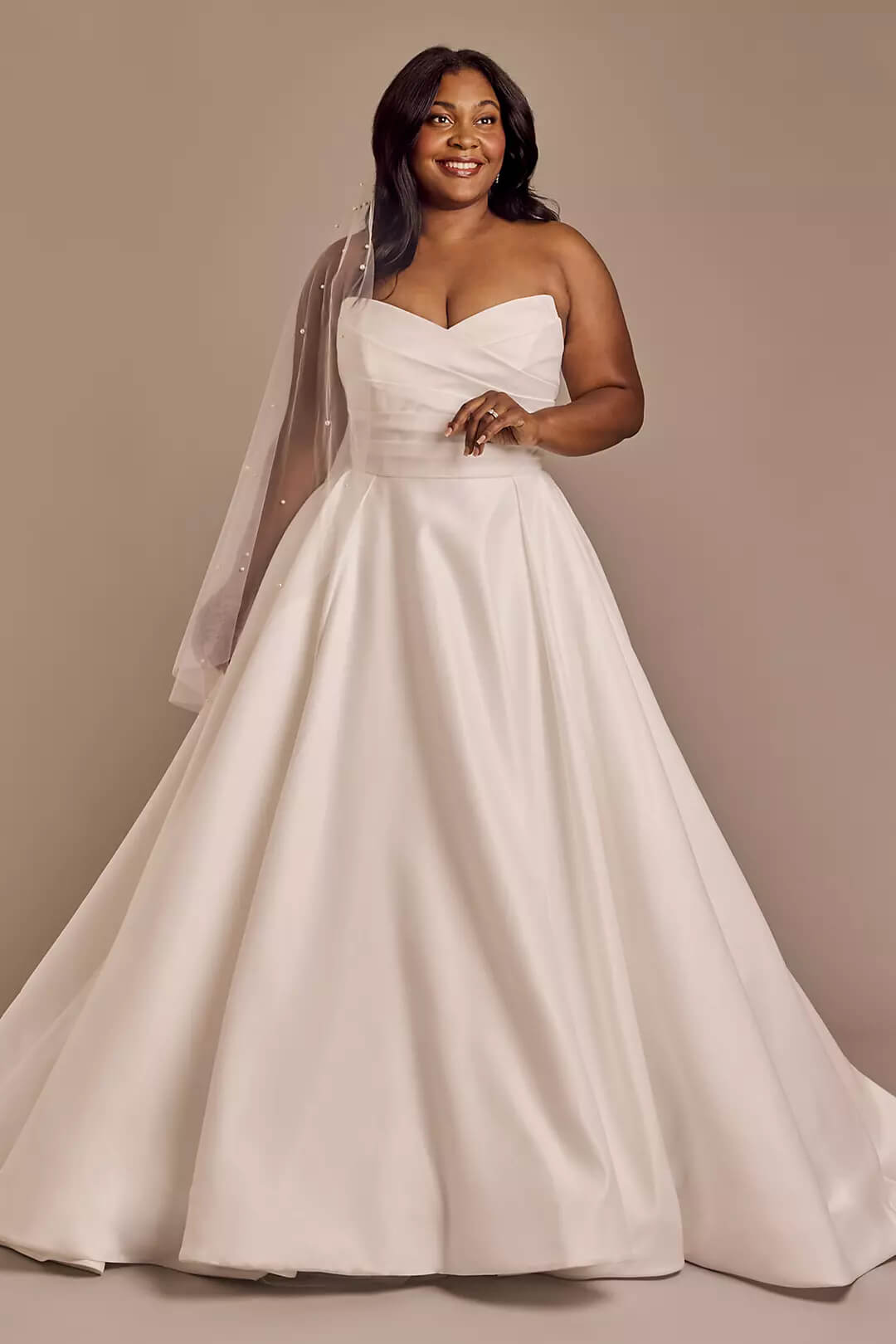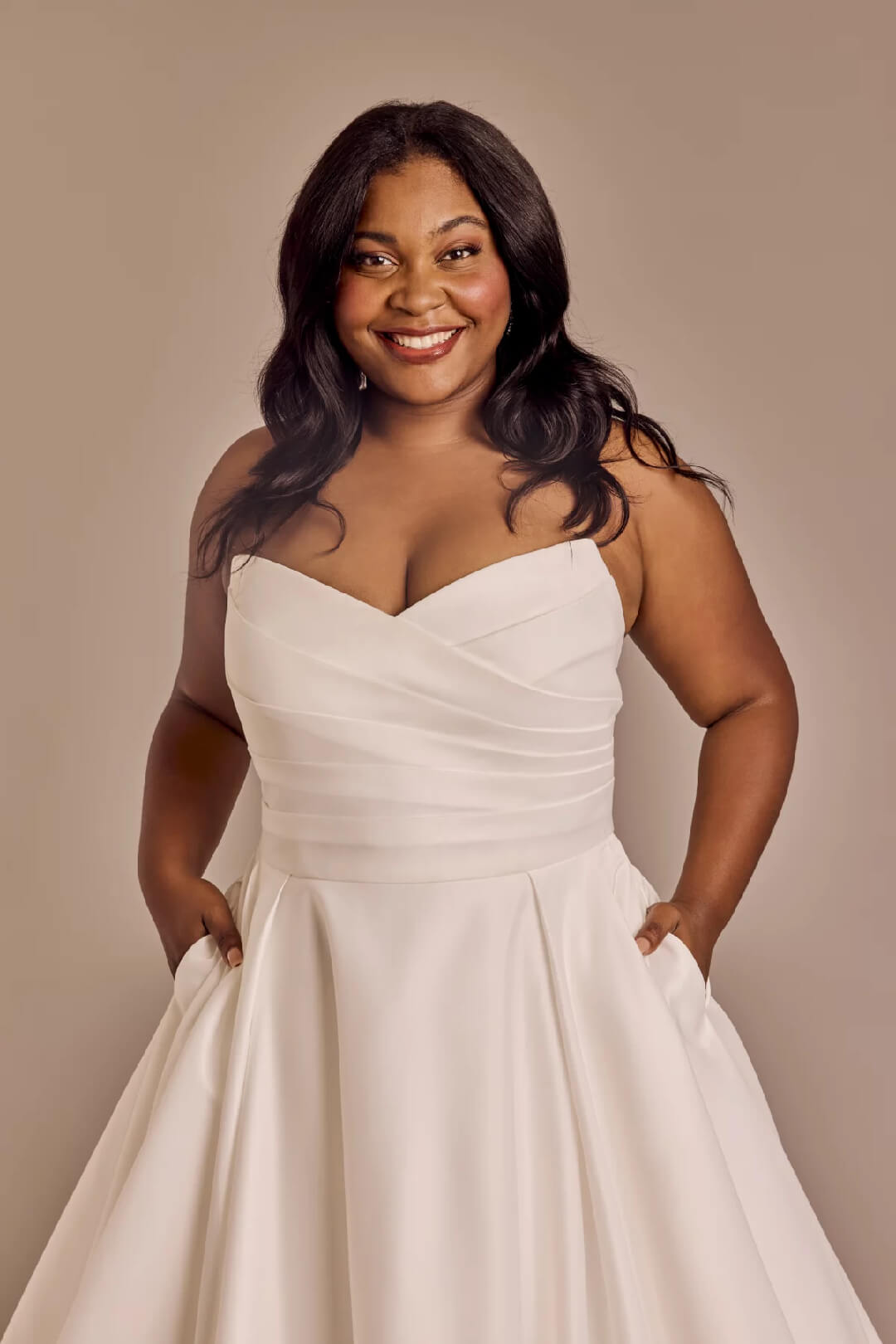 Haz que tu momento sea memorable con este vestido atemporal, el satín drapeado en el escote y la falda crean el look perfecto para la novia clásica y elegante.