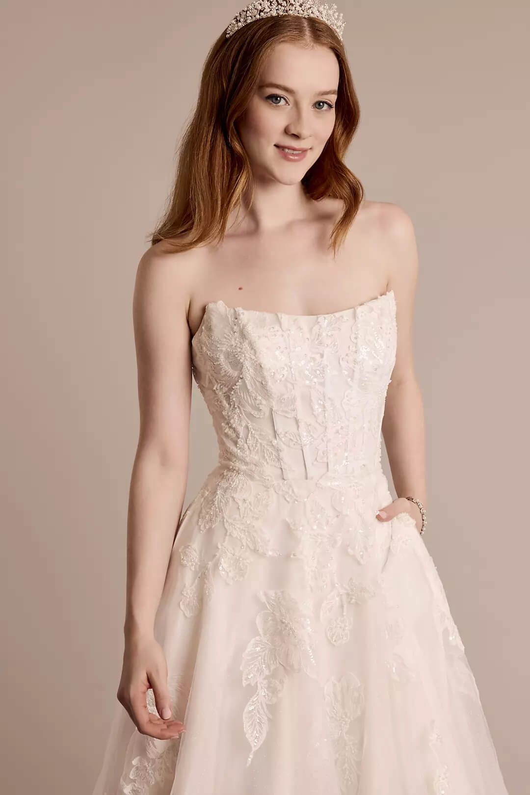 Este vestido de corte A tiene delicadas aplicaciones de encaje en el talle que le dan un toque romántico y tirantes desmontables para que puedas cambiar de look
