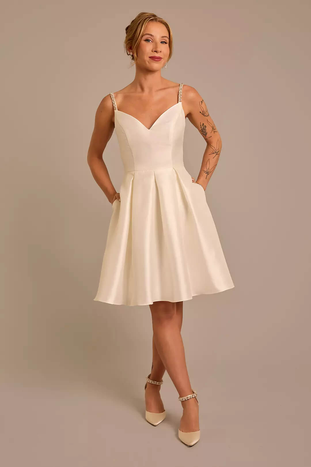 Este minivestido de mikado es el vestido perfecto para lucir hermosa en tu boda civil. Sus brillantes tirantes con cuentas de cristal atraerán todas las miradas.