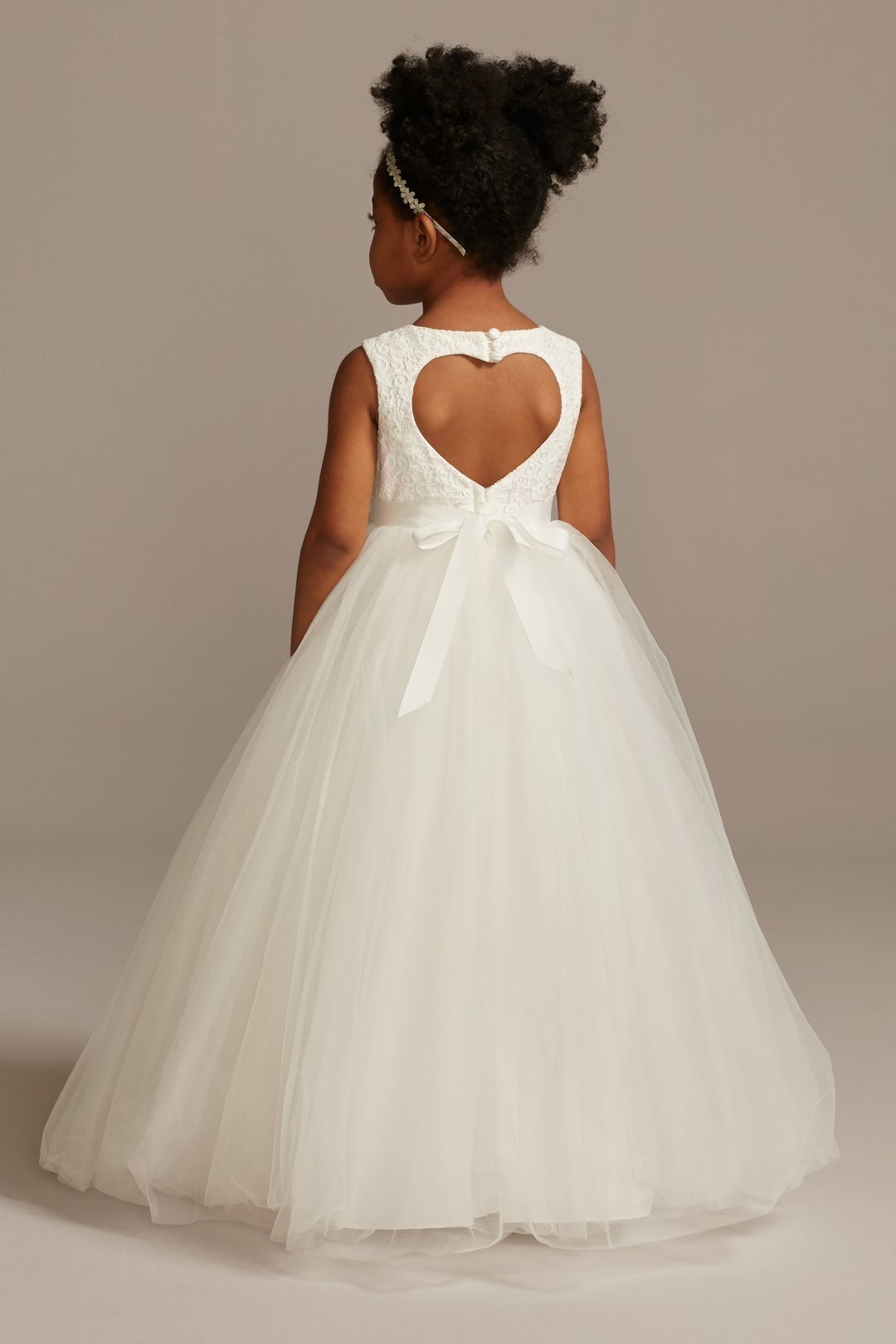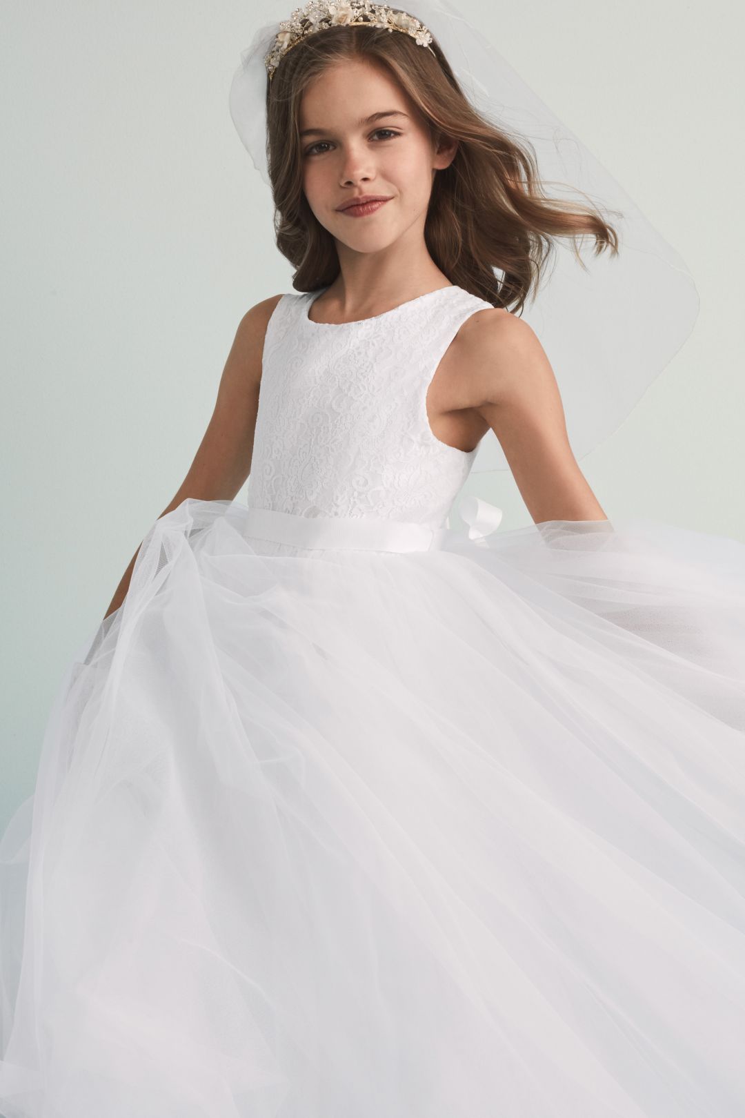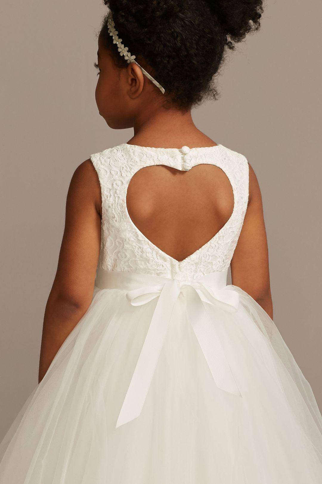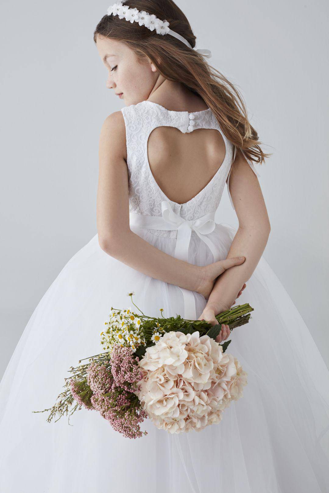 ¡Tu pequeña se sentirá como en un cuento de hadas con este hermoso vestido de primera comunión! Realizado en suave encaje y un lindo listón satinado en cintura, se complementa con una falda de tul estilo princesa y un escote en forma de corazón en la espalda.