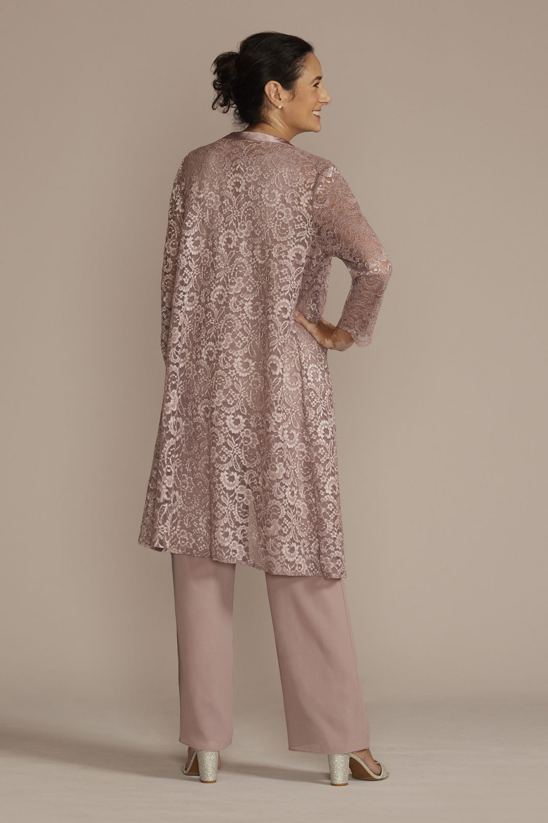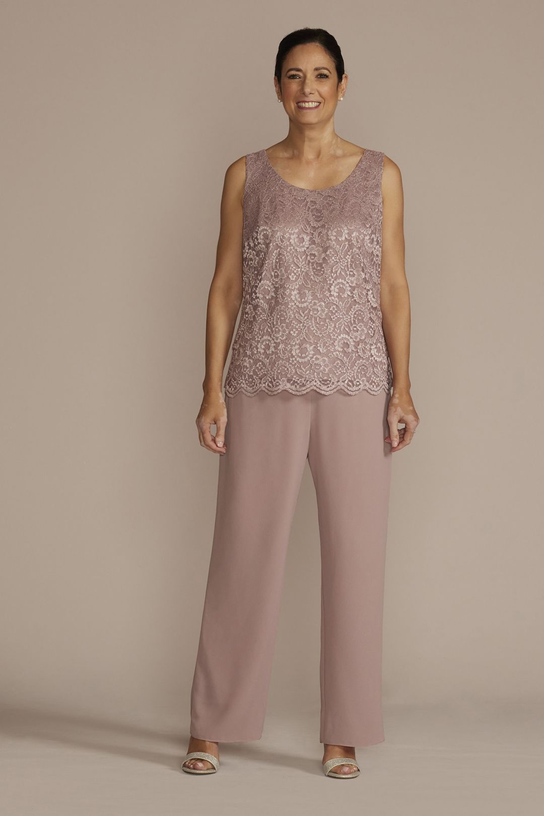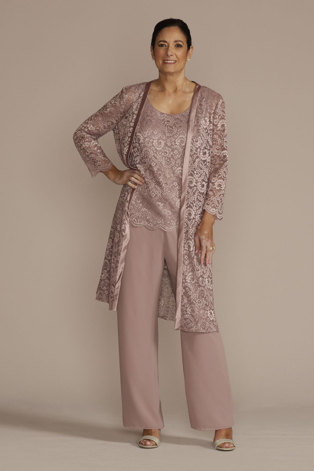 ¡Siéntete elegante y cómoda en este conjunto de tres piezas! Su camisa de escote redondo y pantalón de chifón, se complementan con unalinda chaqueta de encaje, la combinación para crear un look de impacto.