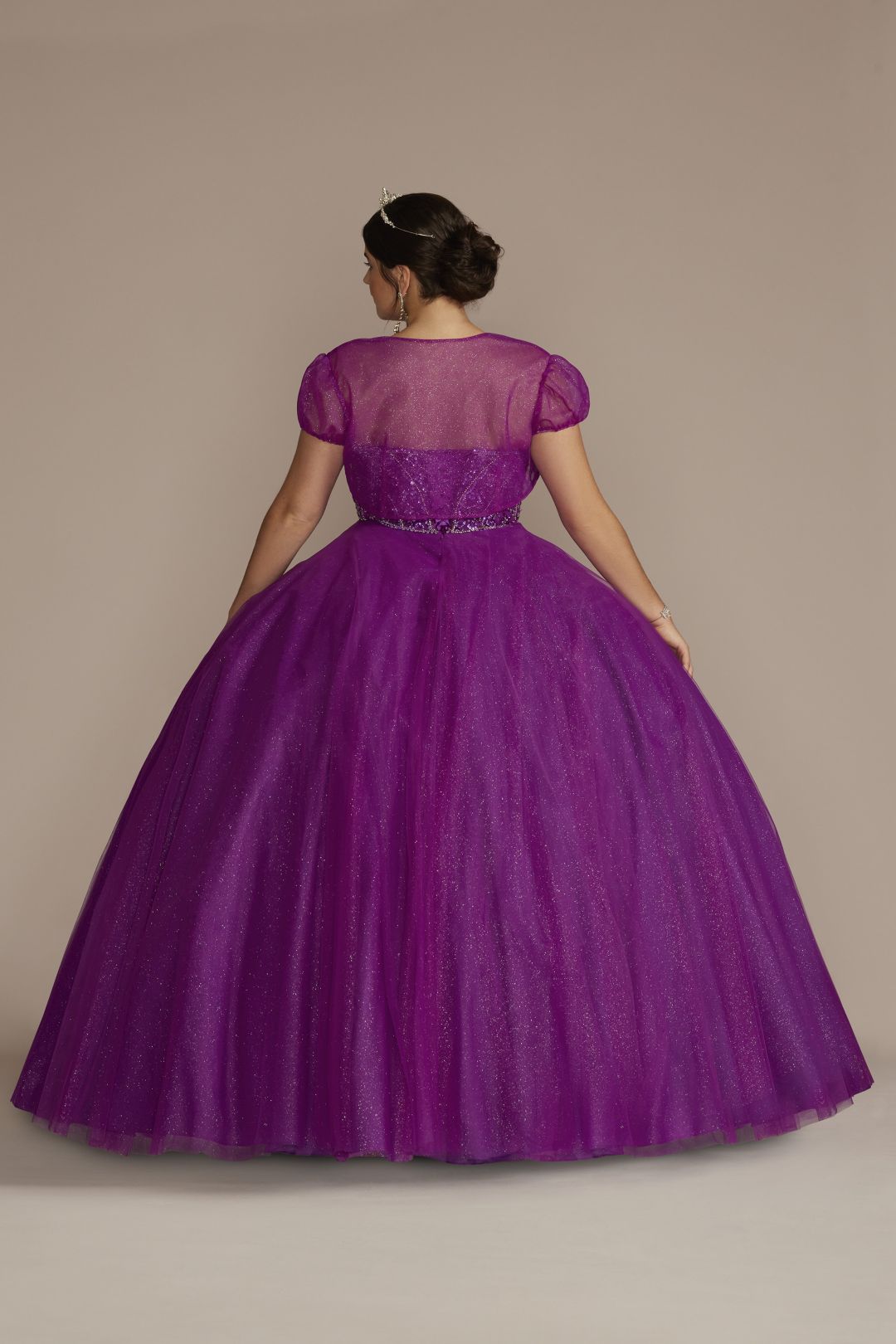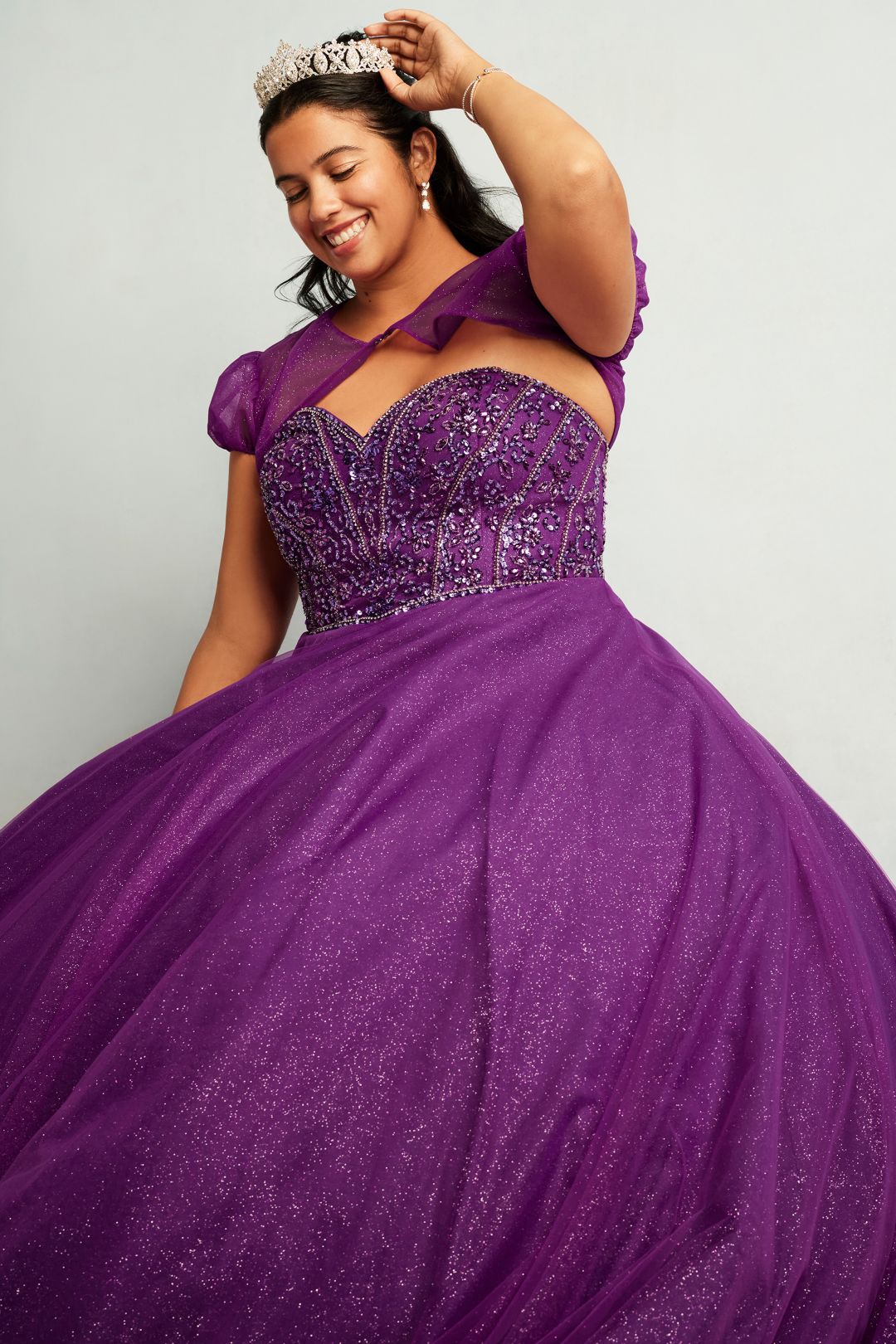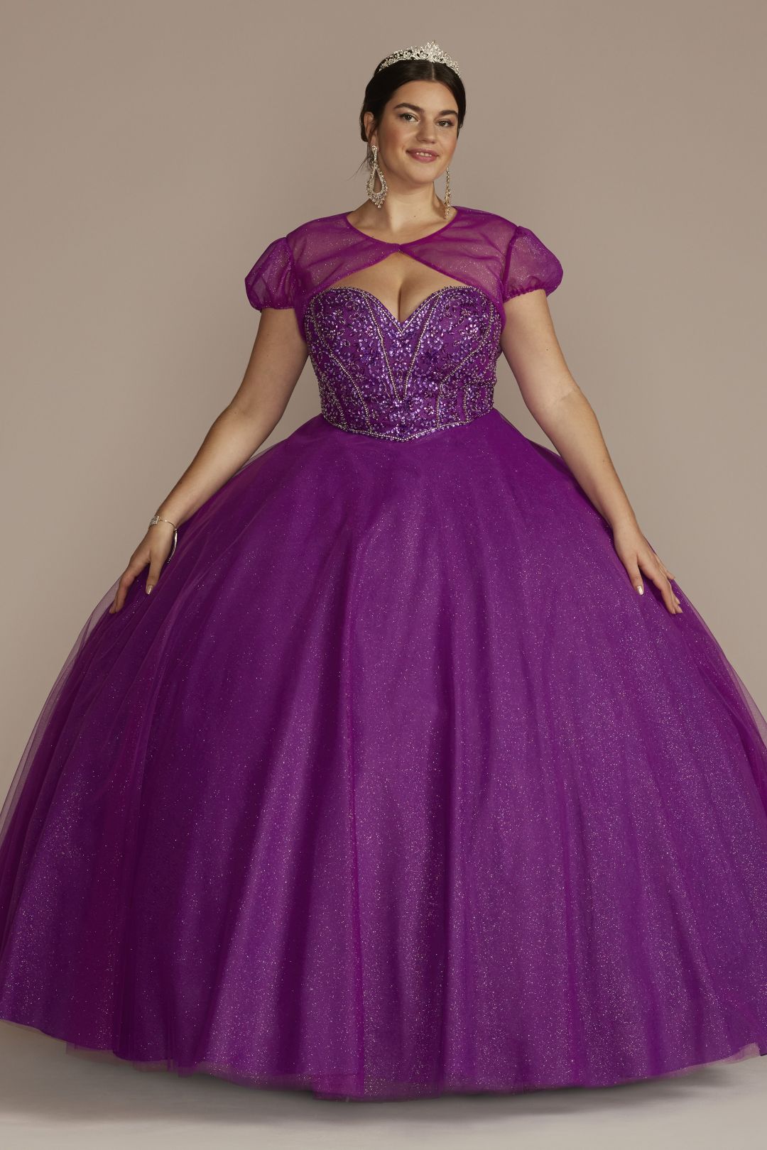 El escoteadornado, tipo corset, se asienta sobre una falda de vestido de gala amplia y se completa con un bolero extraíble para cambiar tu look